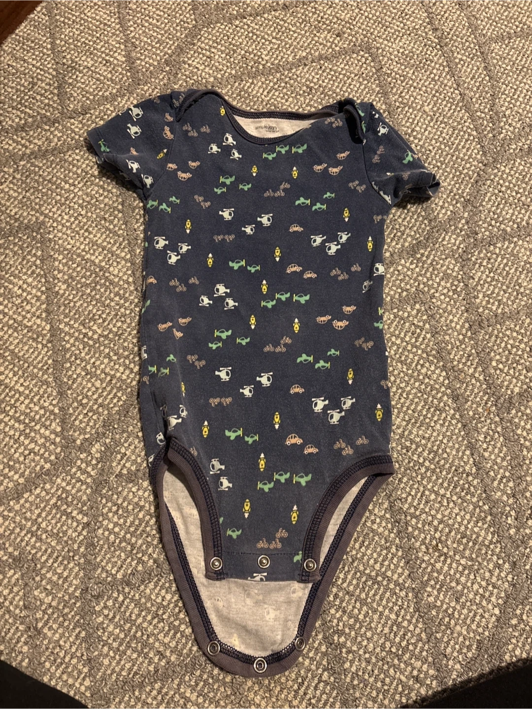 This navy blue baby bodysuit features a fun all-over print of cars, helicopters, and bicycles. It's made from a soft, comfortable fabric for your little one. The snap closure makes changes a breeze. It's great for everyday wear!