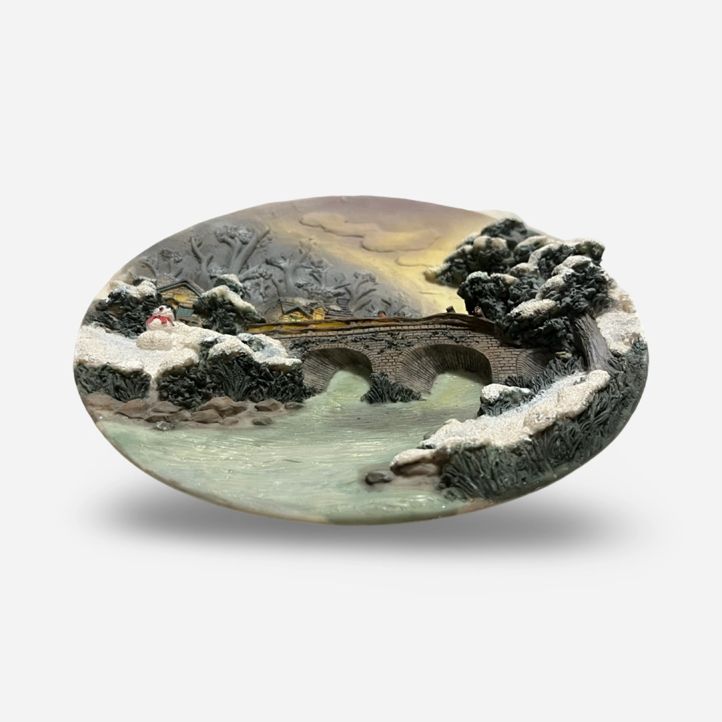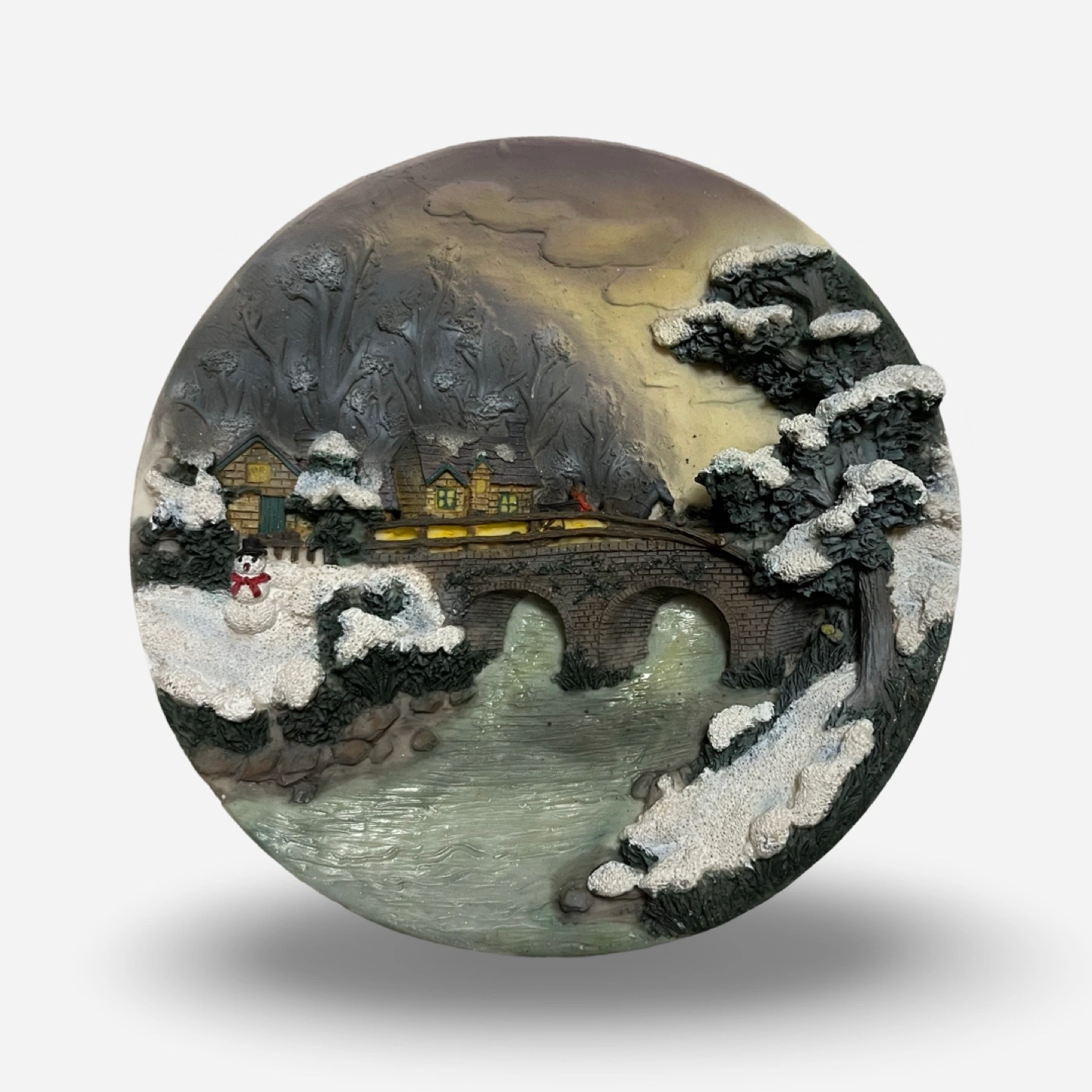 Beautiful winter scene wall hanging. Features a quaint village beside a river and bridge. Embossed details. Ready to hang. Pick up during weekdays only.