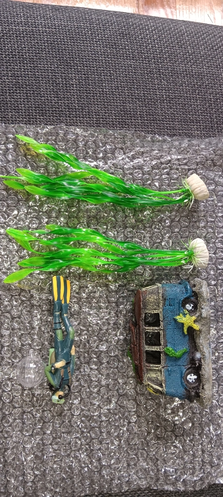 Great bundle for your fish tank. Includes assorted plastic plants and resin VW bus with diver figurine. Perfect for adding life and character.