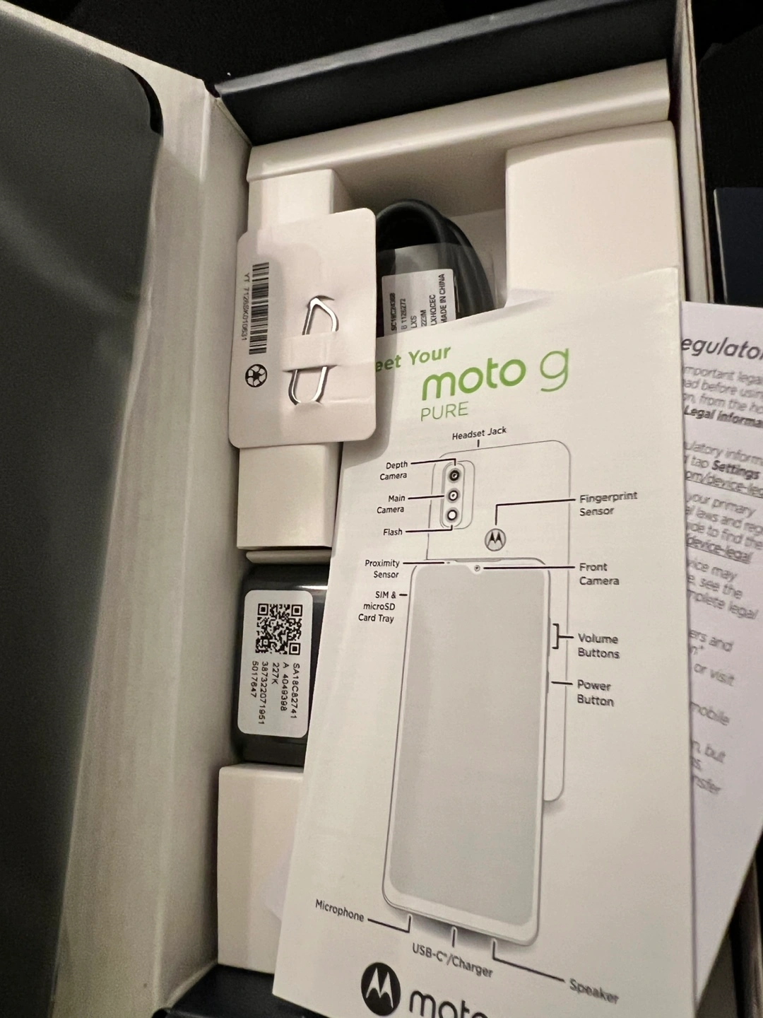 1 brand new Motorola G Pure Android smartphone, everything in the box with charger, cable, and SIM tool.