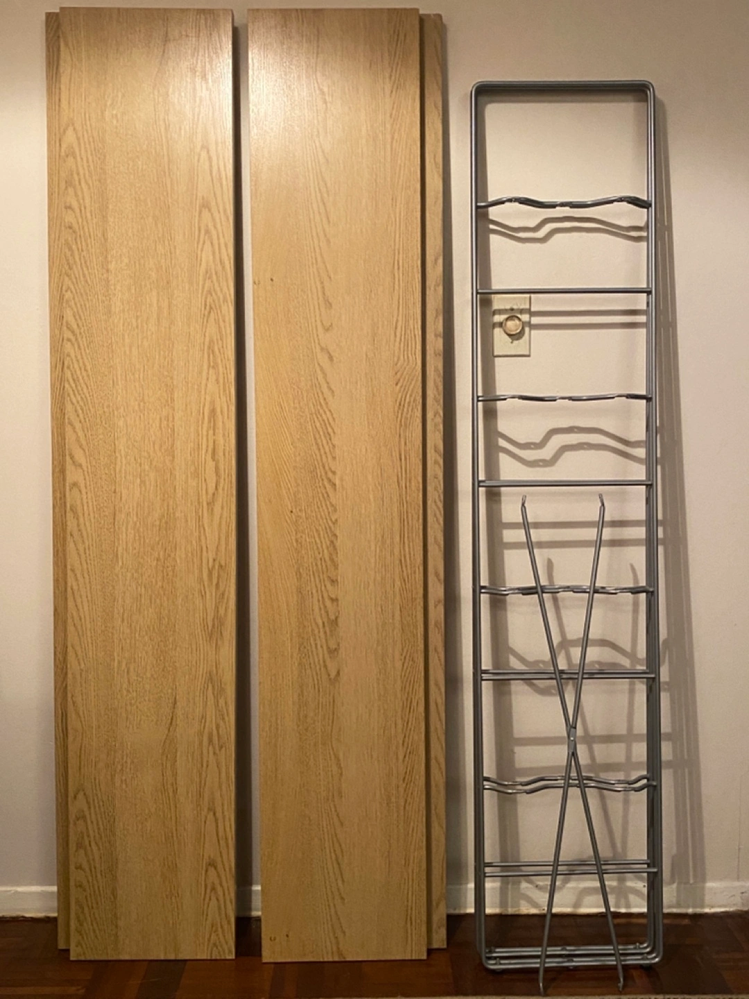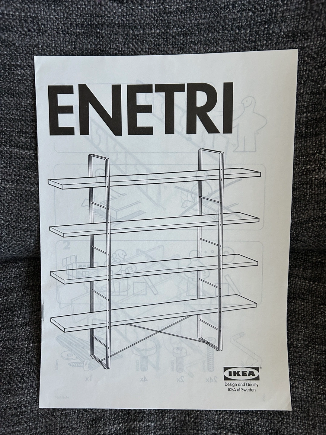 IKEA ENETRI shelf. Disassembled for transportation. Includes four shelves and metal frame. Some minor damage to bottom shelf corner (shown in photo). Hardware included (new replacement set from IKEA). Good condition.