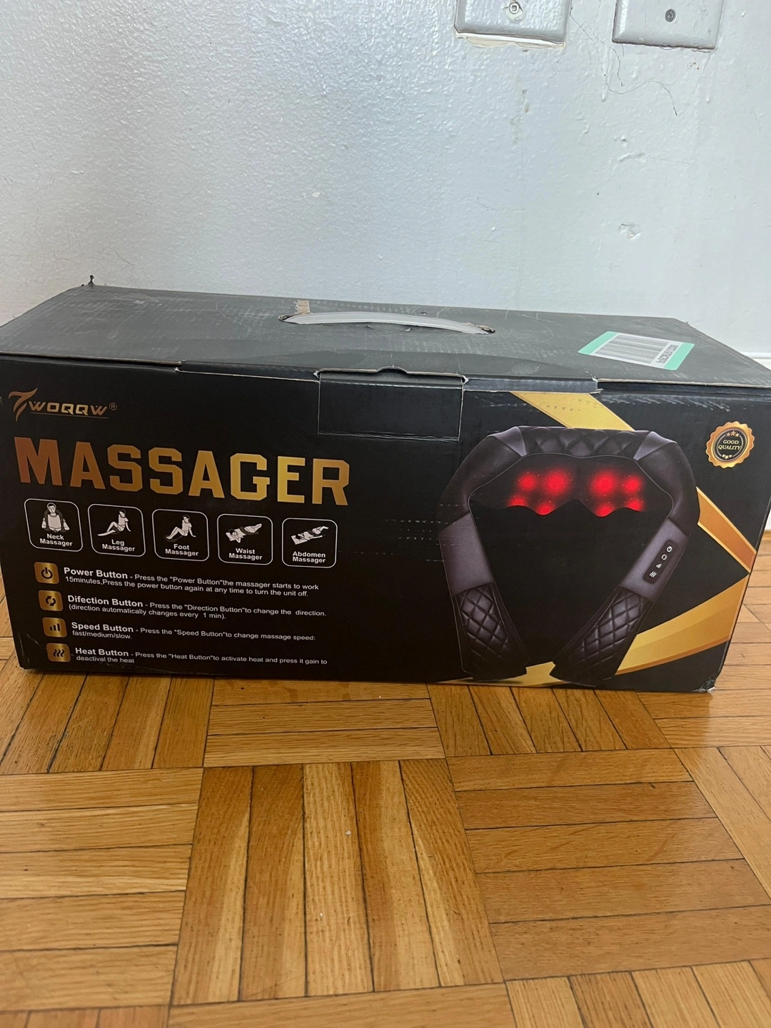 Portable massager with heat function. Multiple massage areas including neck, back, legs, waist, abdomen, and feet. Easy-to-use controls. Perfect for home, office, car, or gym.