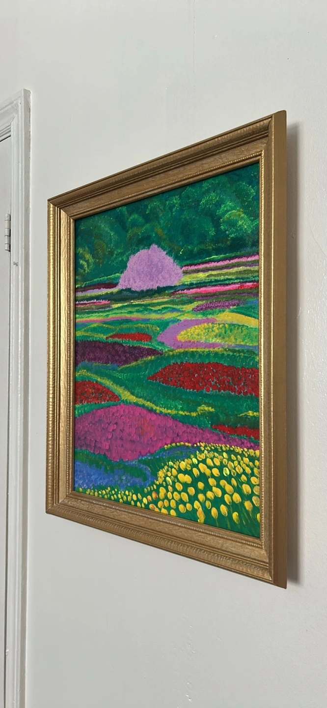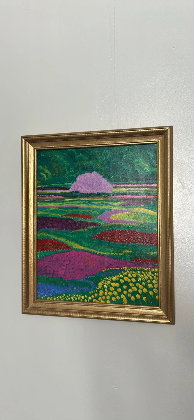 Framed colourful landscape painting. Canvas size 16x20”. Wood frame 20x24”. Depicts a field of flowers with a purple tree in the background. Gold-coloured frame. Looks great on a wall.