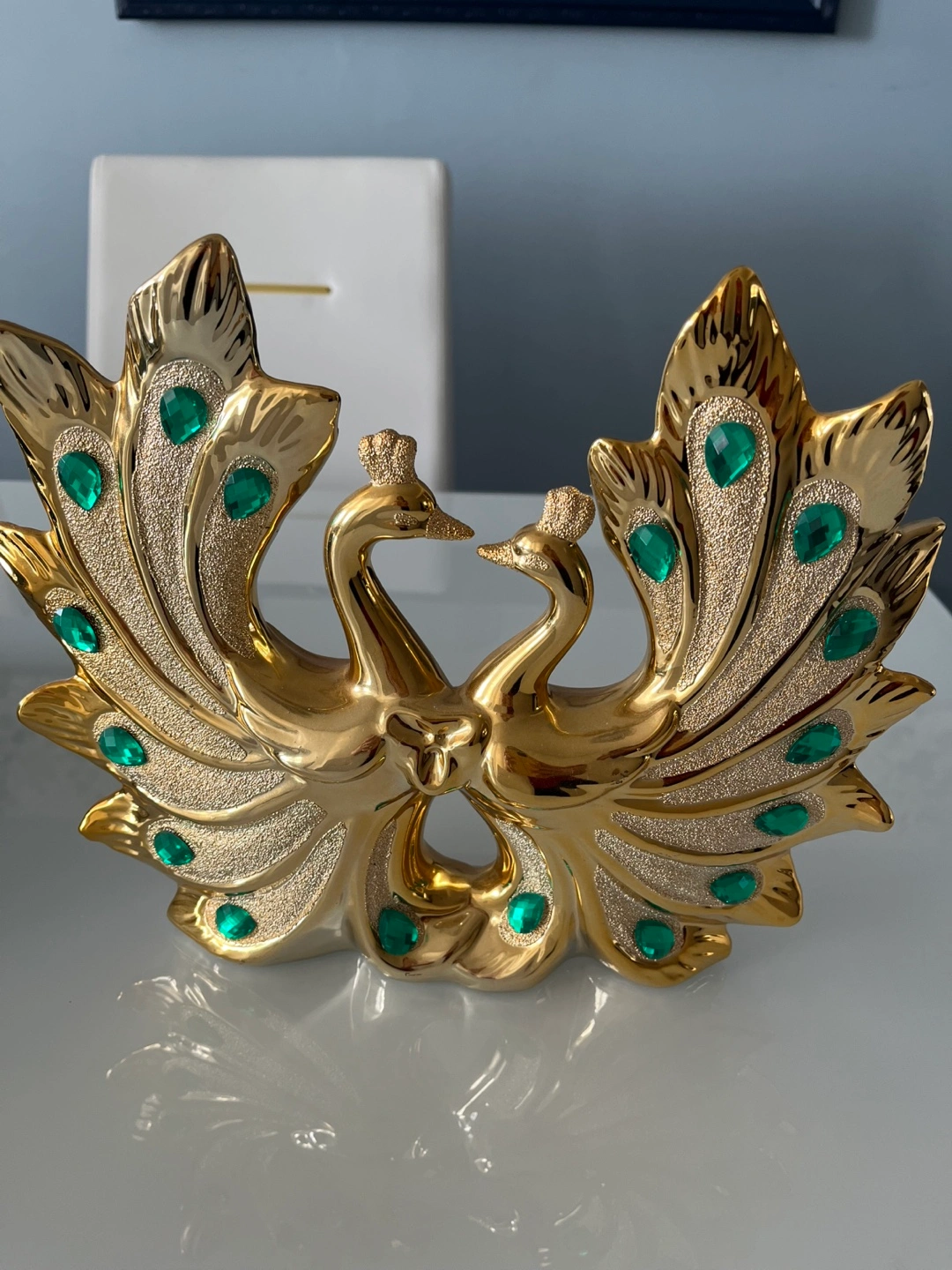 235Stunning gold ceramic peacock figurine. Features emerald green accents. Unique decorative piece. Perfect for home décor.