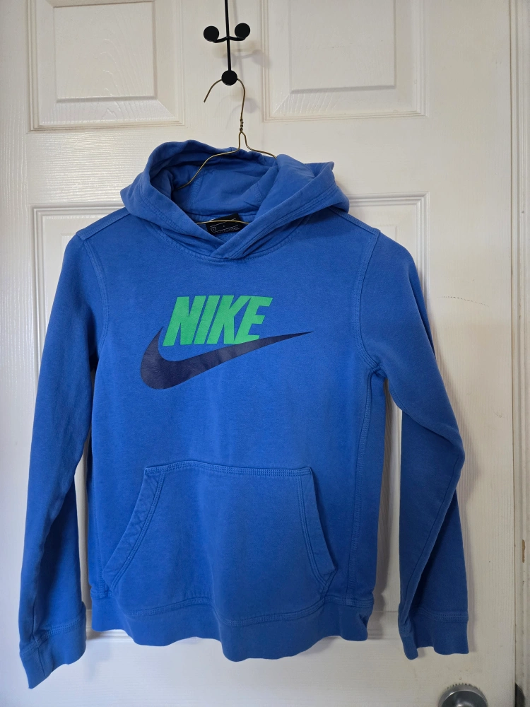 Blue Nike hoodie. Large size. Features a large Nike logo on the front. CASH ONLY