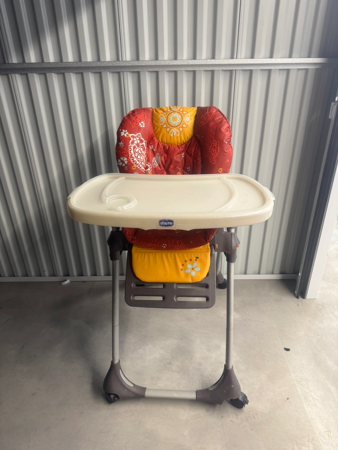 Used Chicco Polly highchair. Red and yellow patterned, easy clean material. Features adjustable height and tray. (With easy clean detachable tray). Wheels for easy mobility.