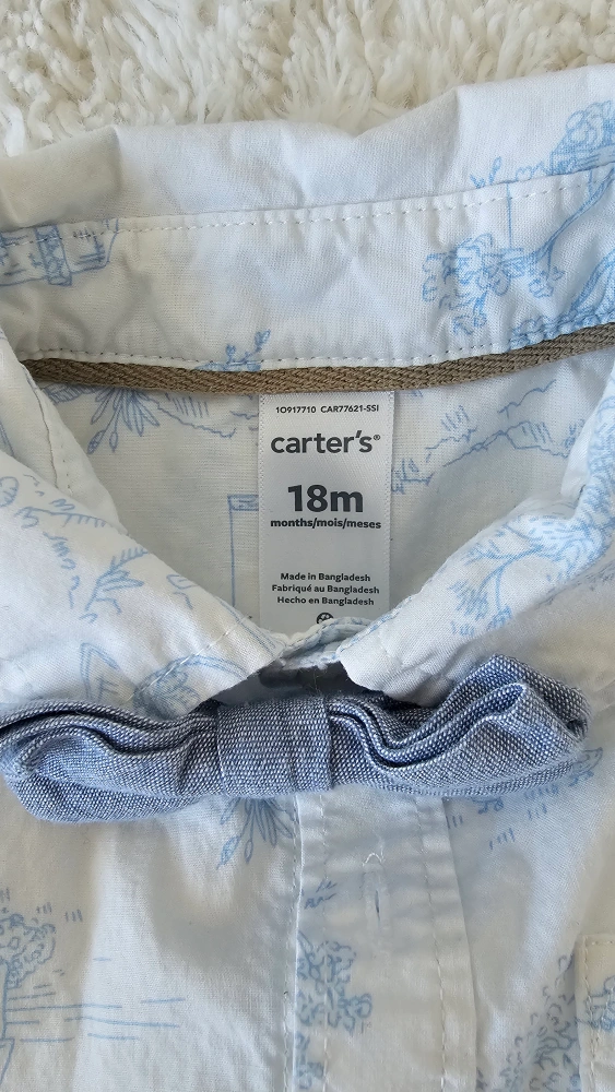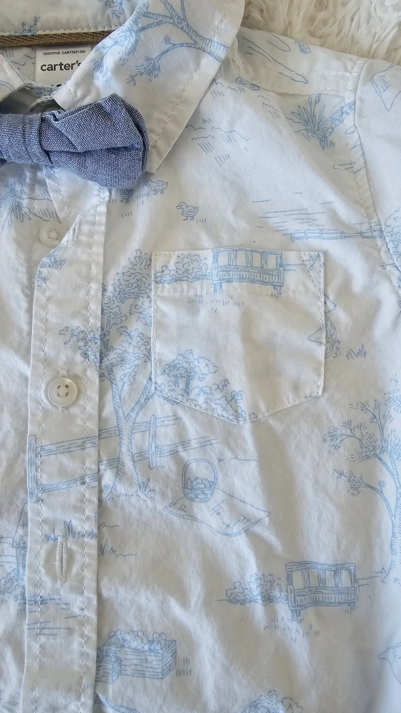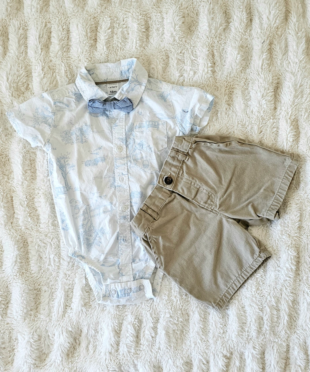 153Adorable Carter's baby boy outfit. perfect for Easter. Includes a button-down shirt with a bow tie and coordinating khaki shorts. Light blue and white pattern. 18 months size. Pickup in Midtown SW, Airdrie