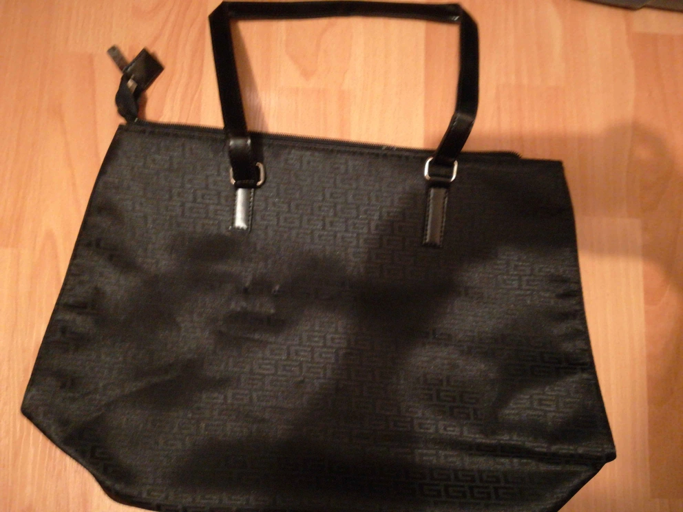 31Black tote bag. Features a zipper closure and two leather shoulder straps. All-over subtle geometric pattern.