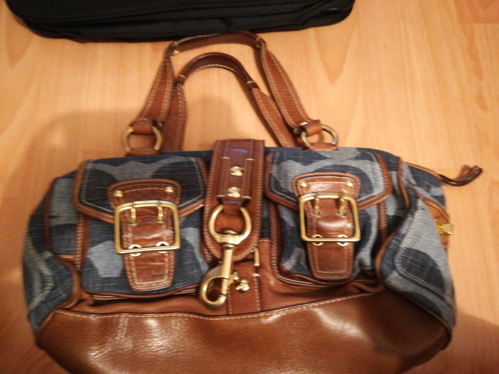 Gorgeous Coach handbag. Denim and brown leather. Multiple pockets and compartments. Gold toned hardware. Shoulder straps.