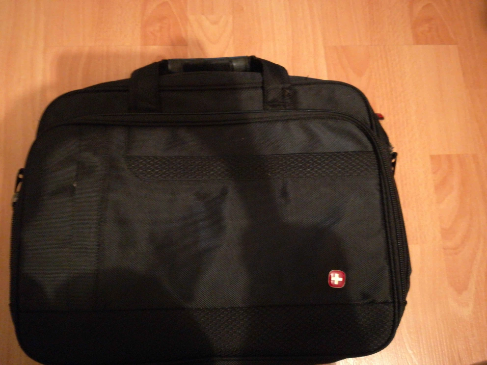 Black laptop bag. Features a top handle and zipper closure. Good for carrying a laptop or other small items.