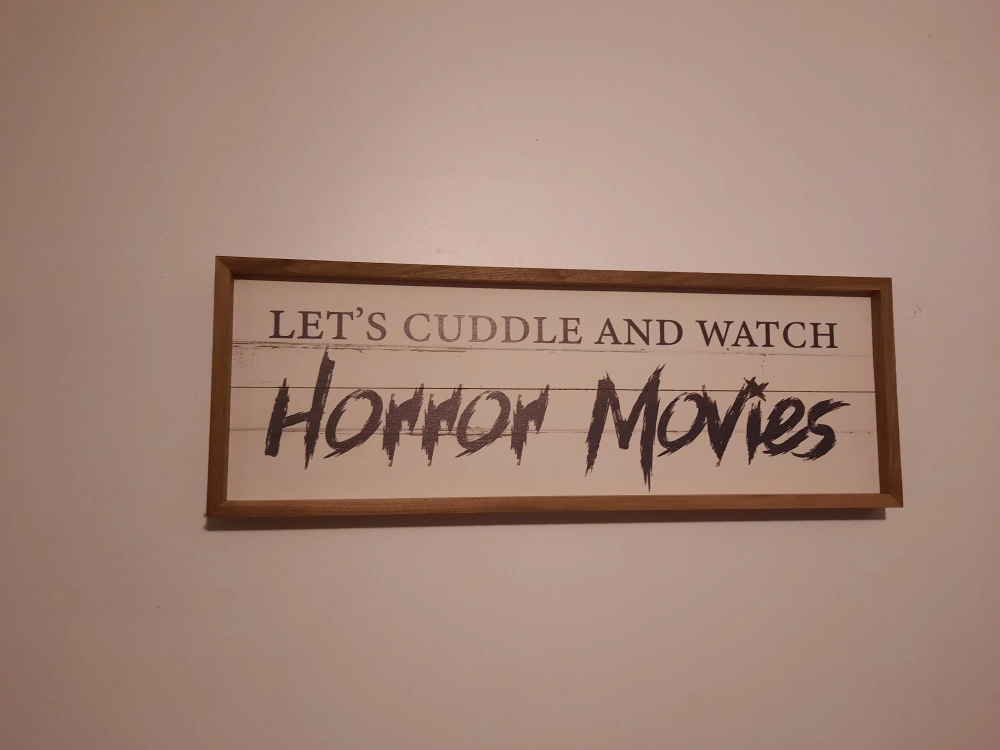Framed wall sign. Features a rustic design. Says "Let's Cuddle and Watch Horror Movies". Perfect for horror movie lovers.