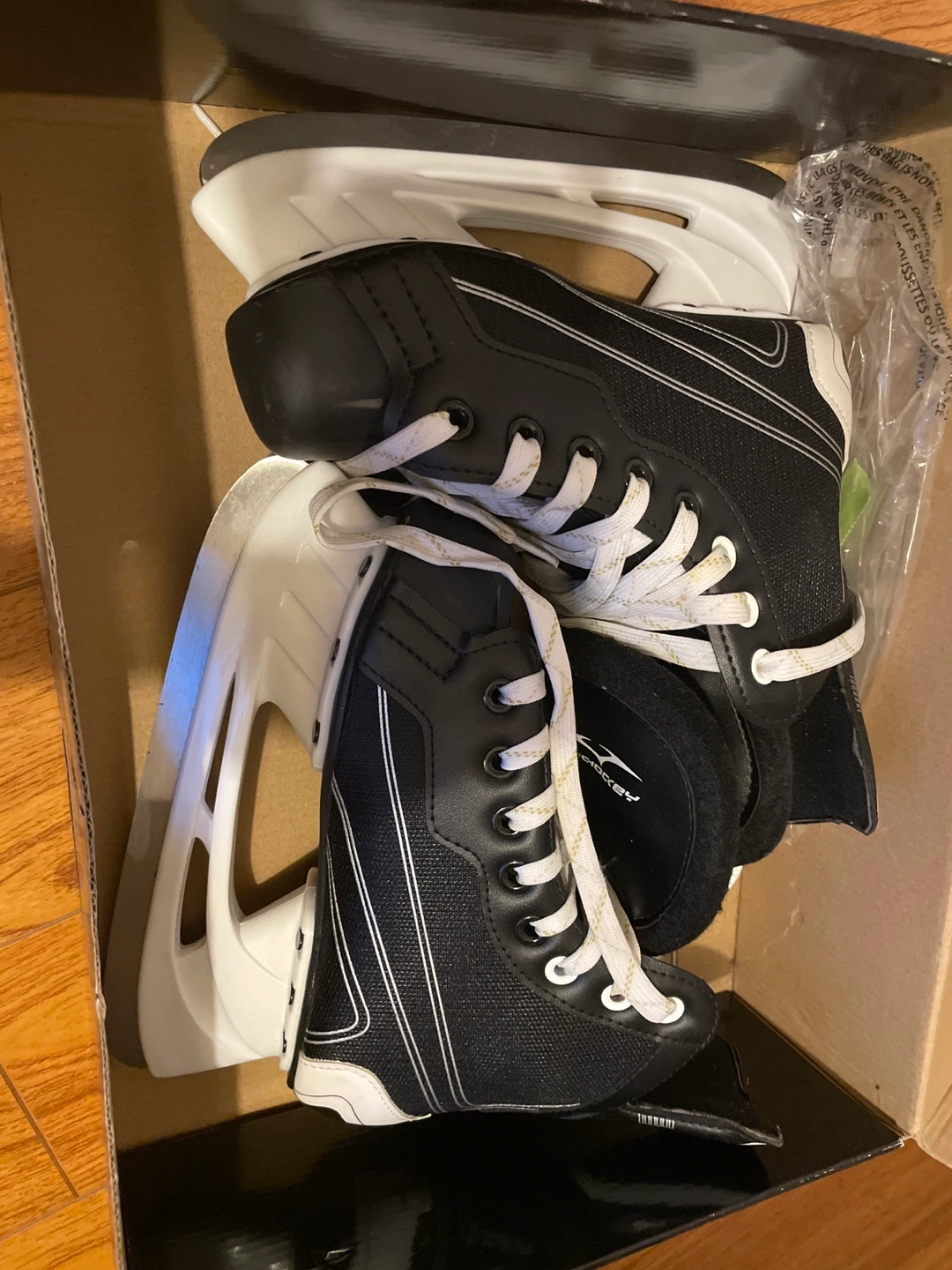 New boys' hockey skates, size 4. Black with white accents. Lace-up closure. Come in original box.