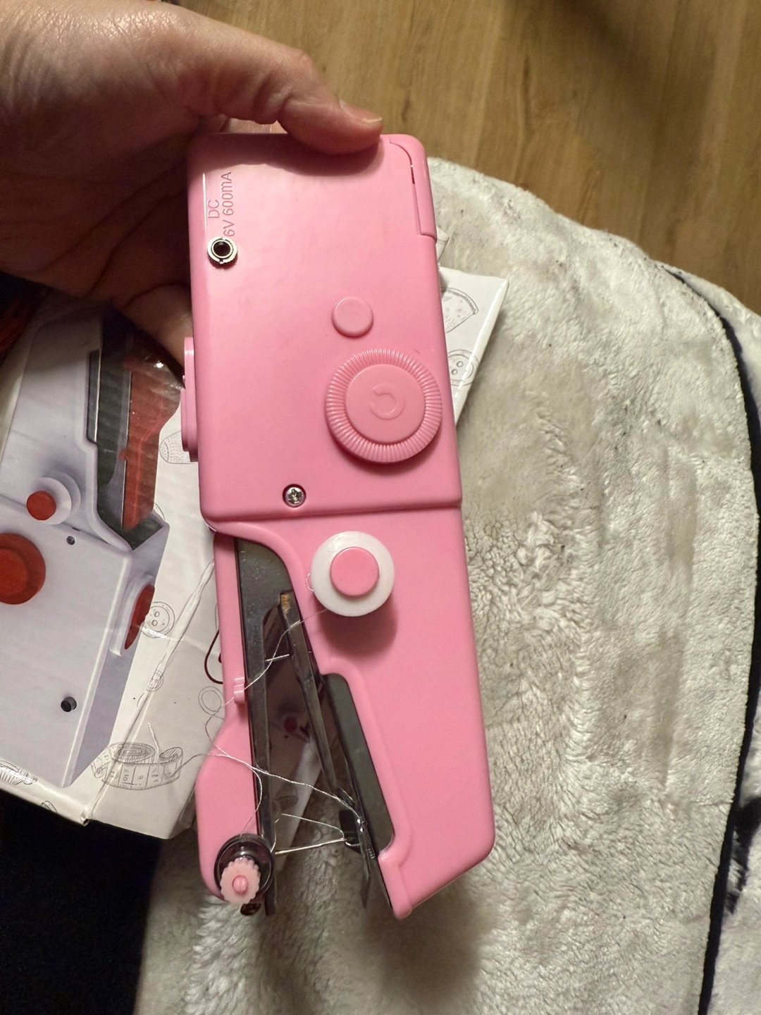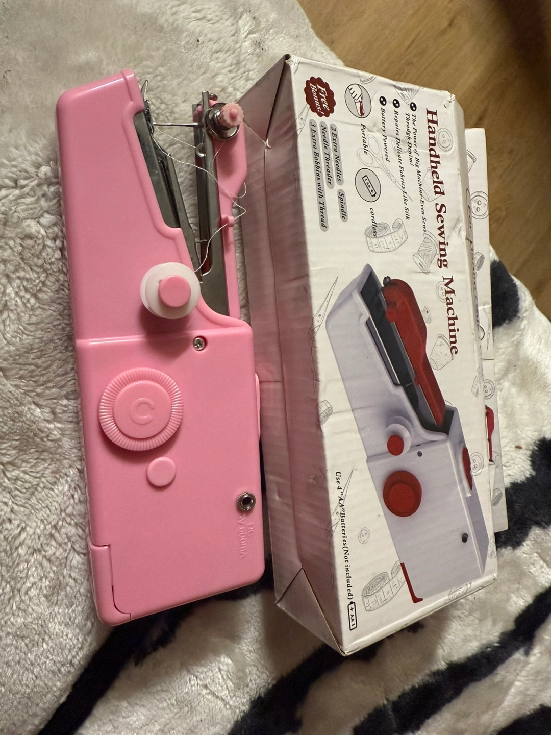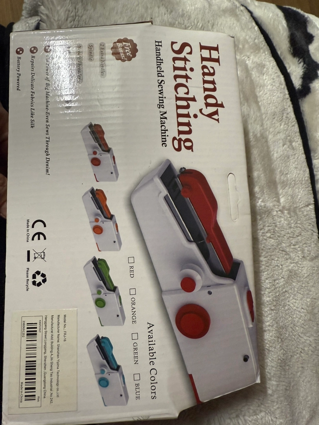 261Portable handheld sewing machine. Battery-powered. Great for quick repairs. Includes needles and thread. Easy to use.