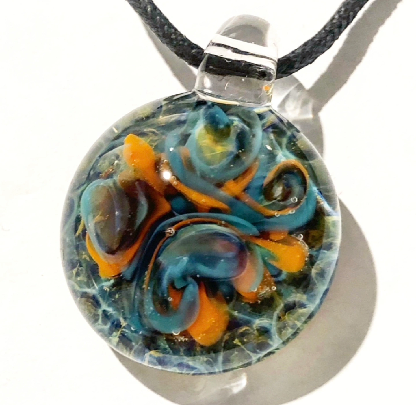 Handcrafted glass pendant necklace. Features swirling teal and orange colours inside a clear glass dome. Black cord included. Beautiful statement piece.