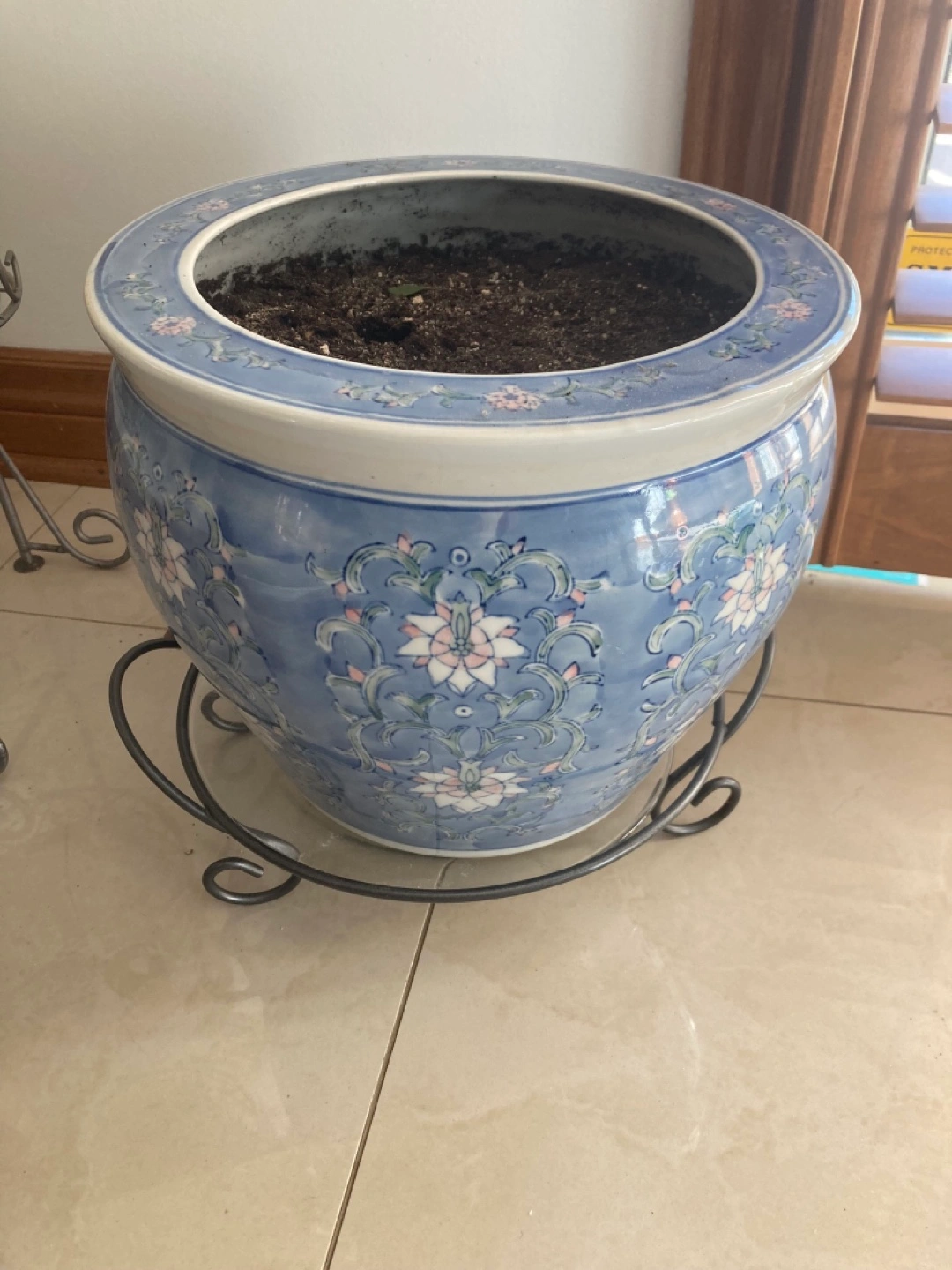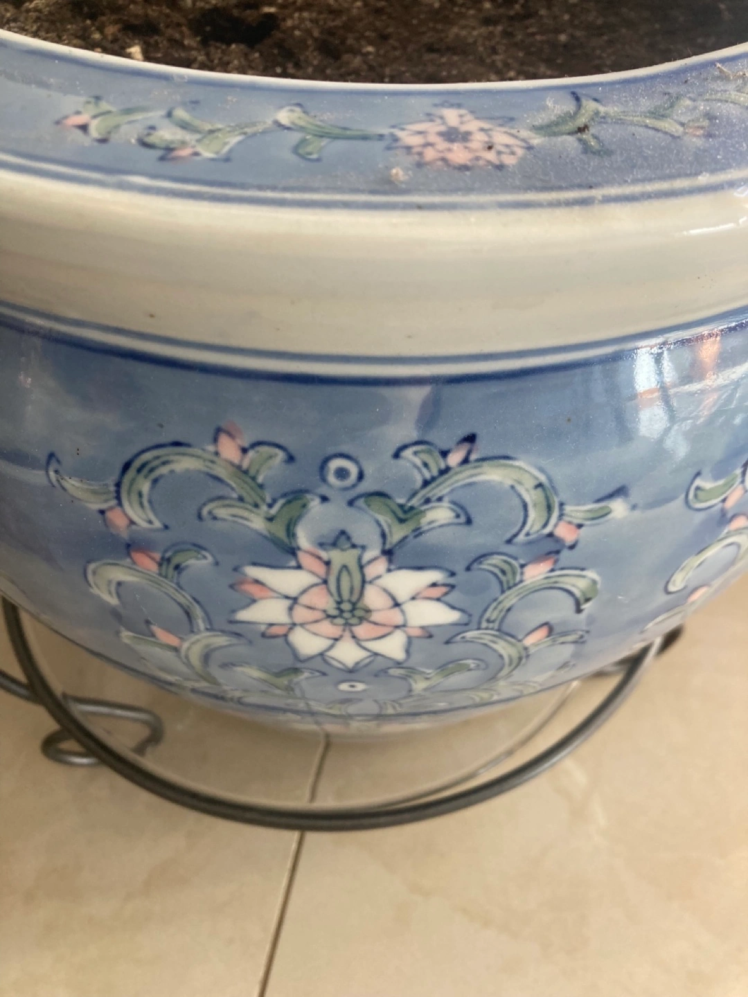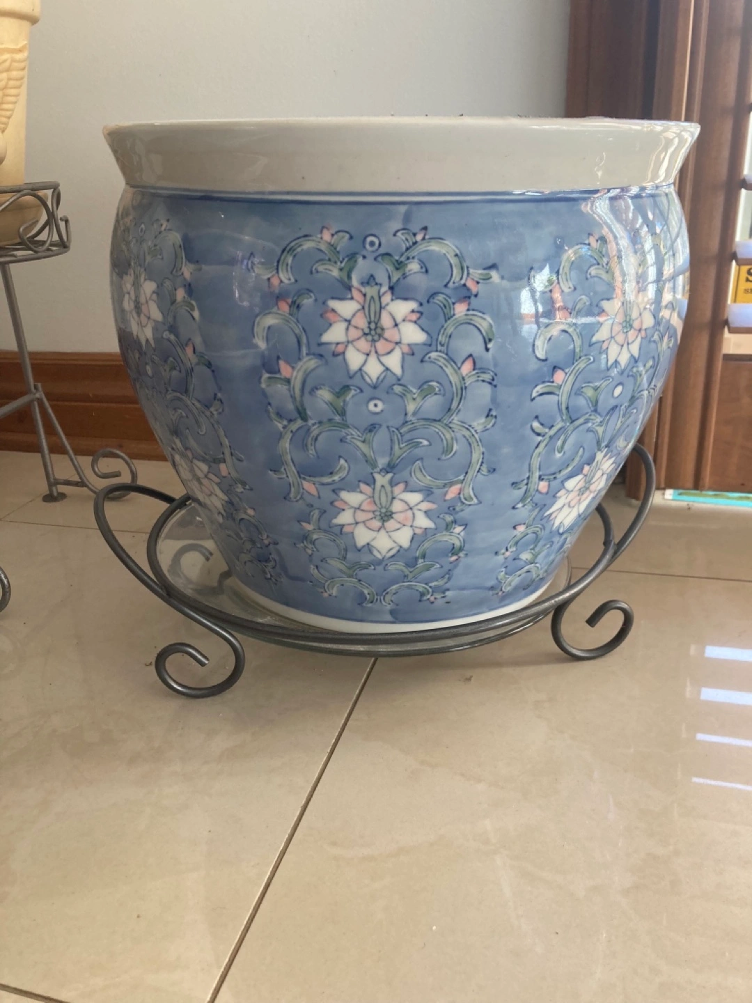 Beautiful large planter. Features a blue and white floral design. metal stand sold separately Approximately 13 inches in diameter. Pot $100 stand $15