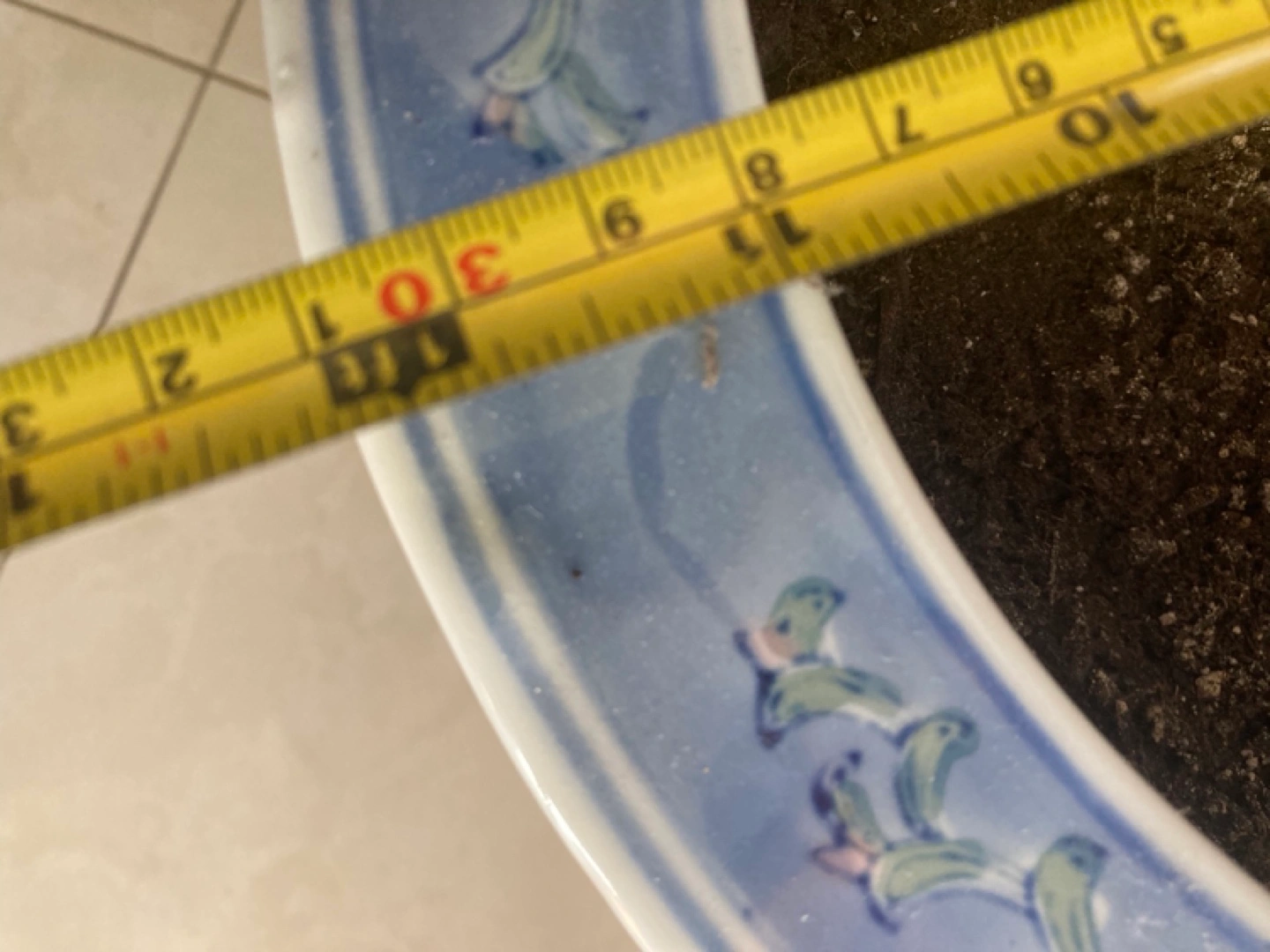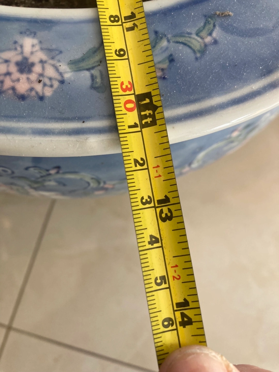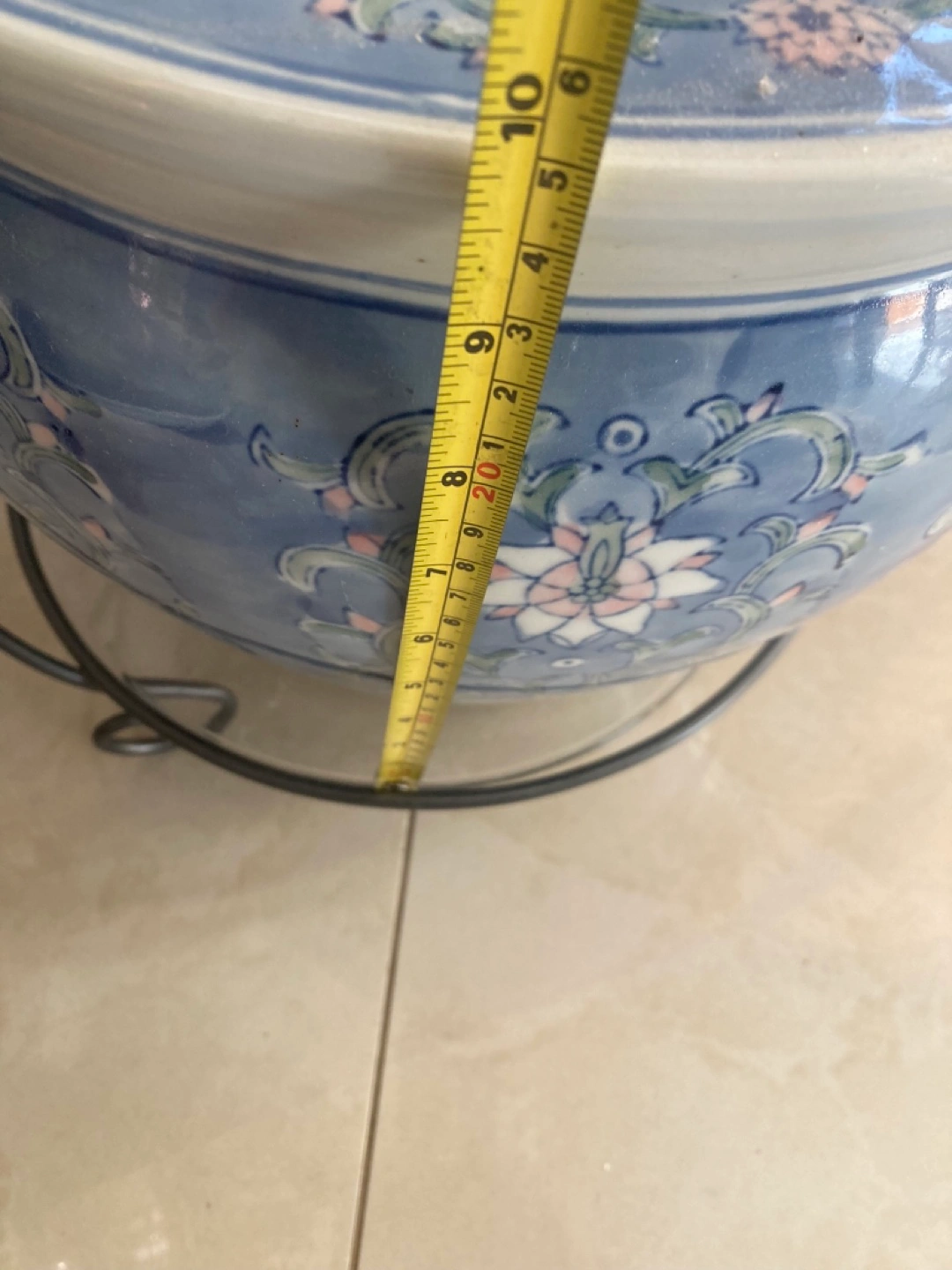 Beautiful large planter. Features a blue and white floral design. metal stand sold separately Approximately 13 inches in diameter. Pot $100 stand $15