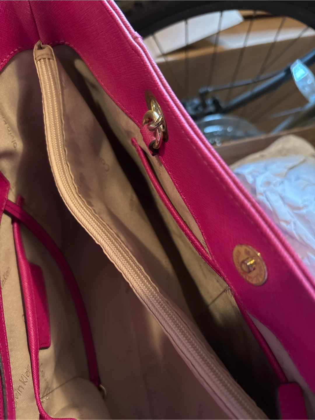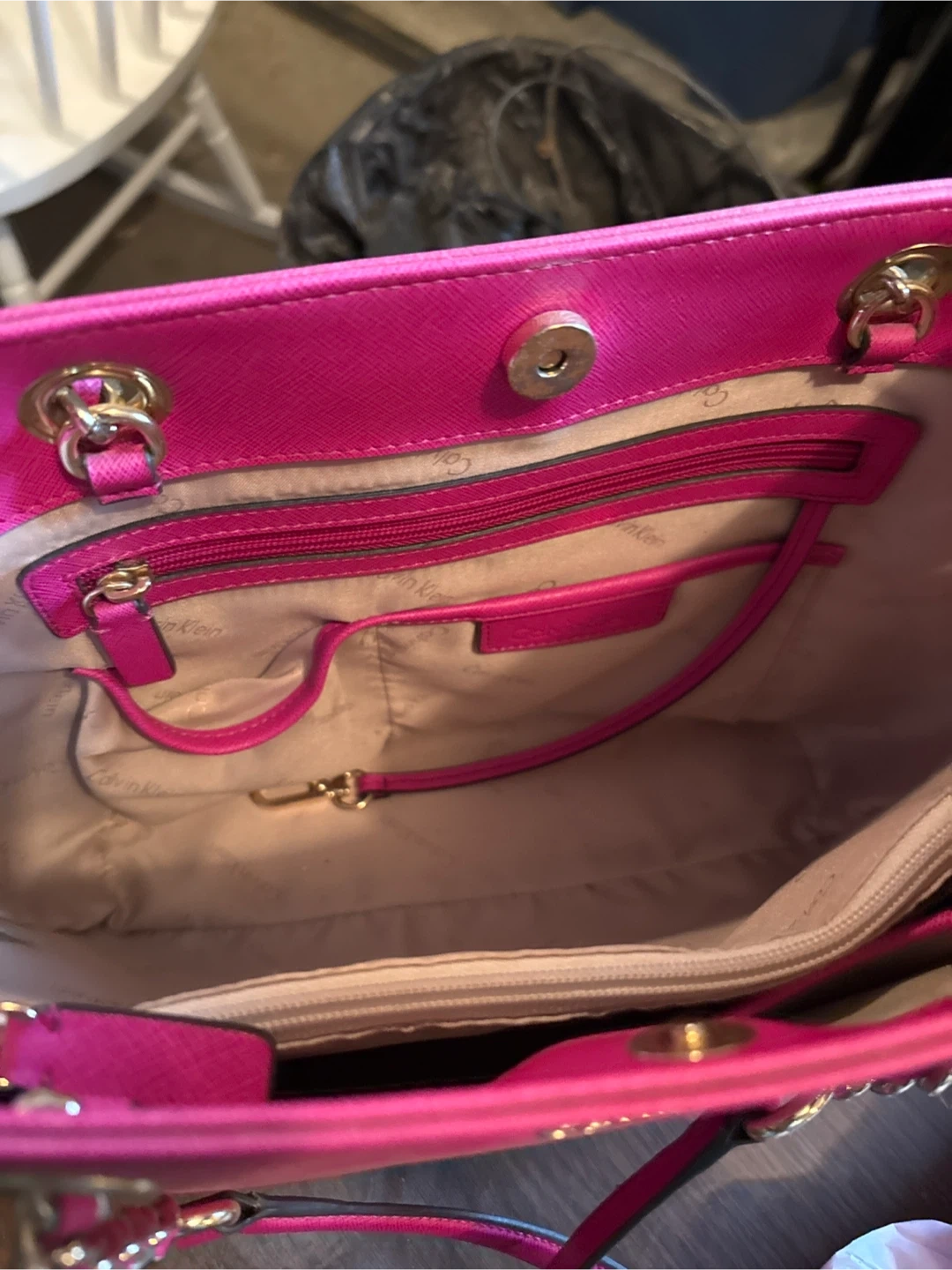 This is a pink Calvin Klein tote bag. It's made of saffiano leather and features gold-tone hardware. Inside, you'll find multiple pockets for organization. It's a stylish and practical accessory for everyday use!