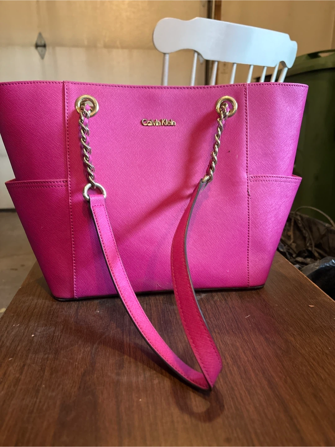 This is a pink Calvin Klein tote bag. It's made of saffiano leather and features gold-tone hardware. Inside, you'll find multiple pockets for organization. It's a stylish and practical accessory for everyday use!