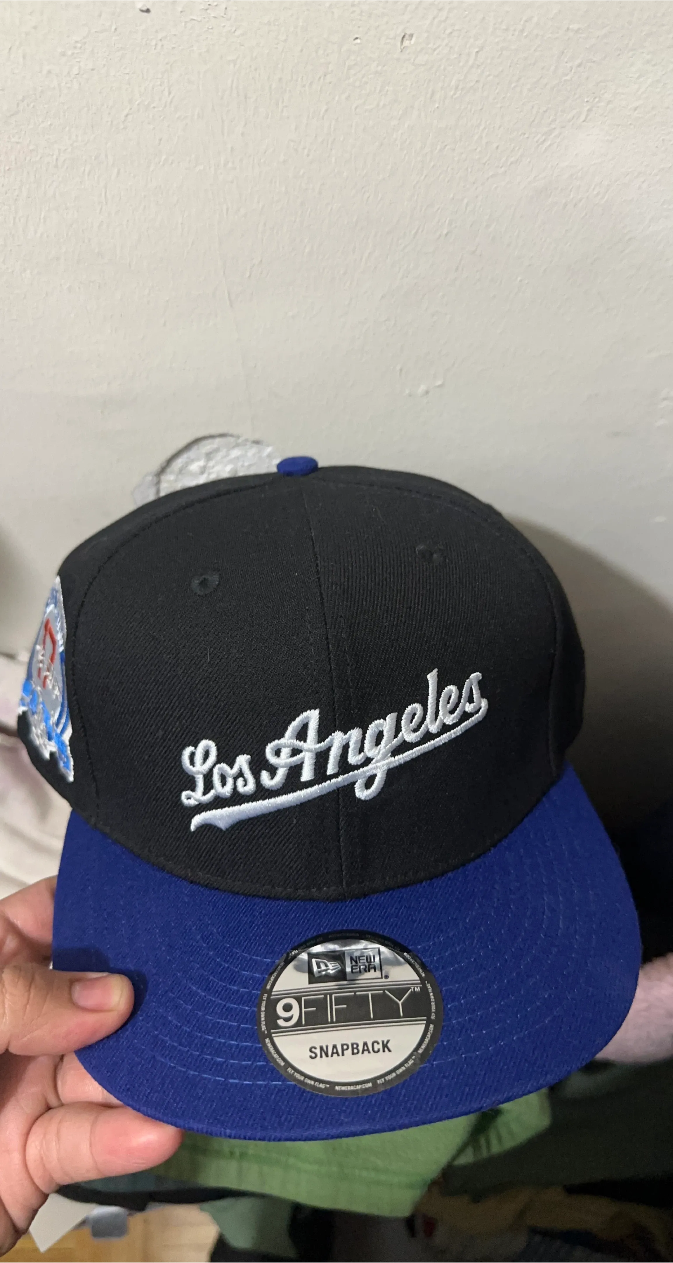 This is a black and blue New Era 9FIFTY snapback hat with "Los Angeles" embroidered on the front. It features a snapback closure for adjustable fit. Great for any fan!