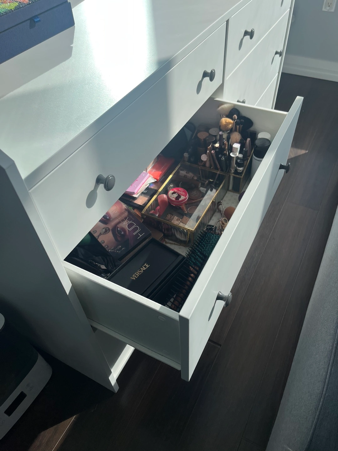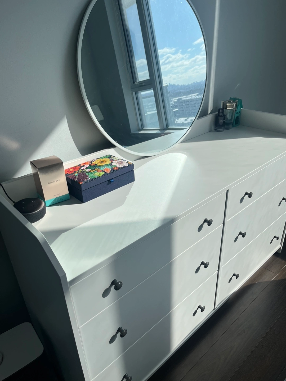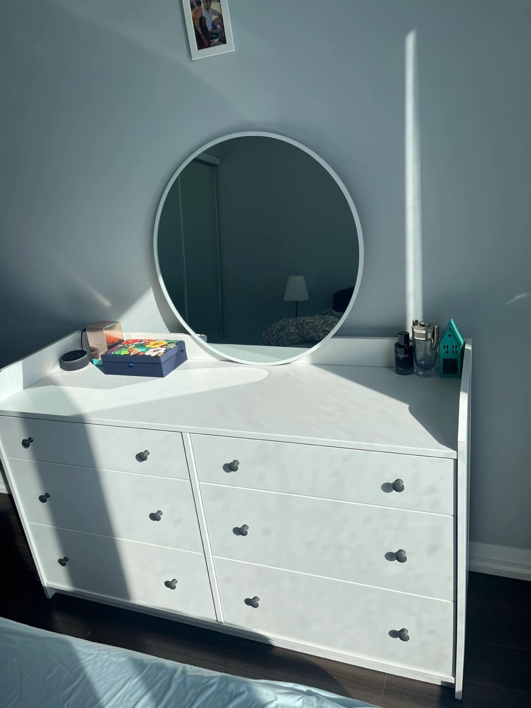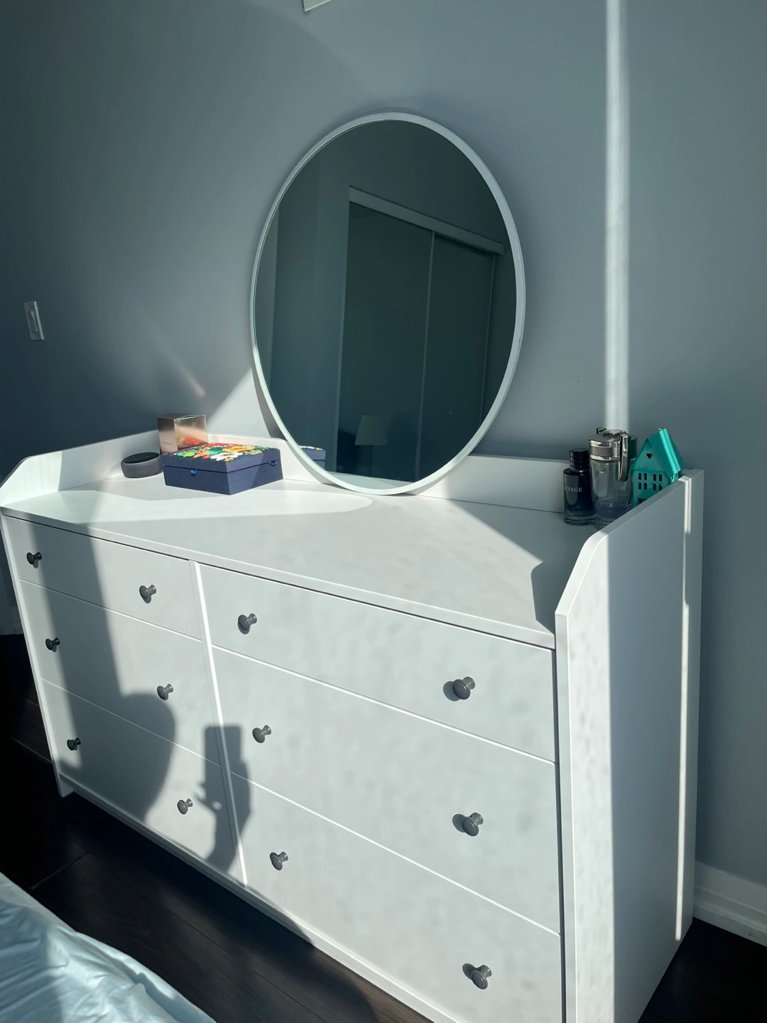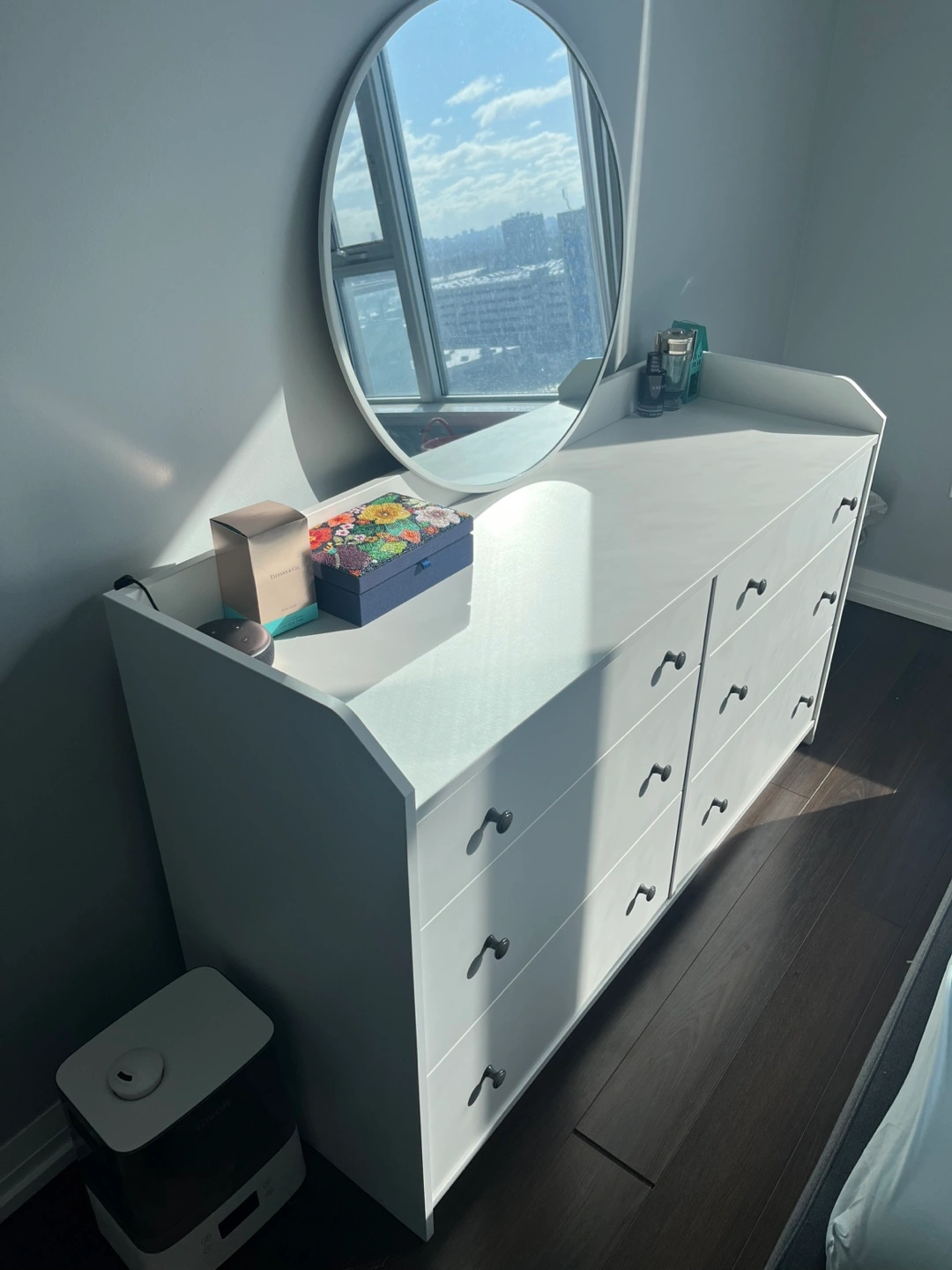 White dresser with six drawers and circular mirror