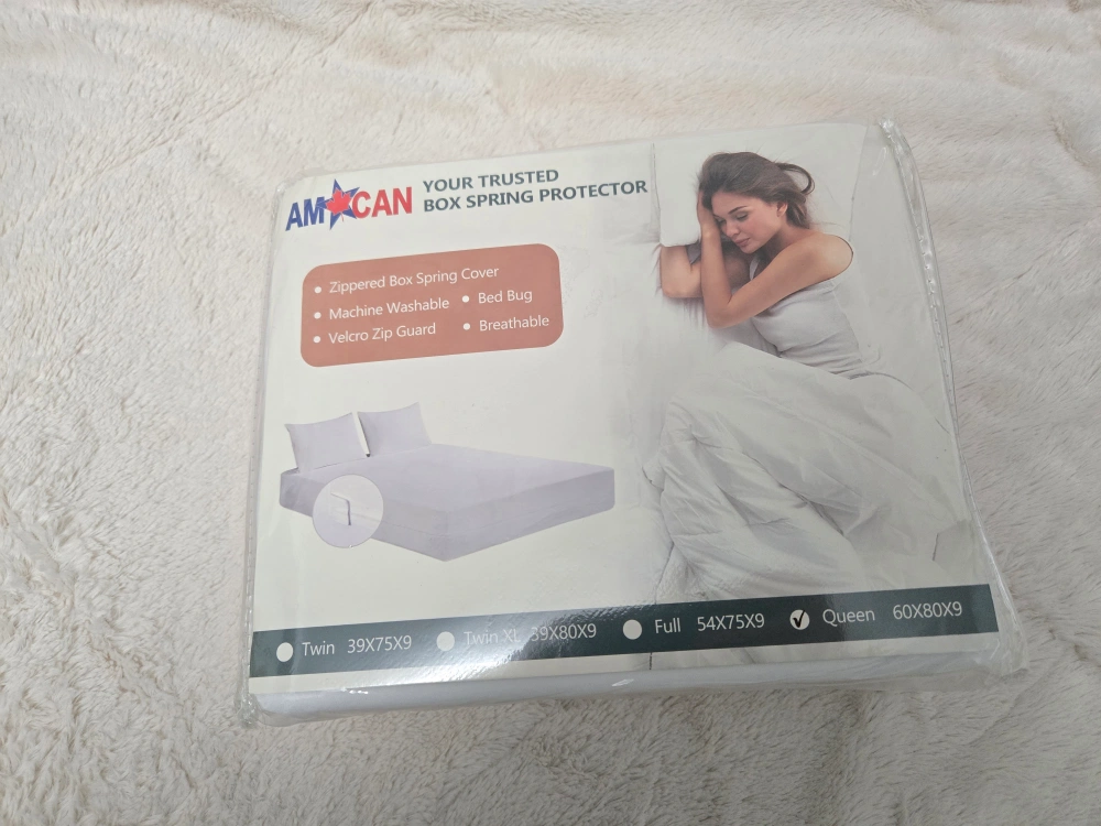 Brand new queen size box spring protector. Zippered, machine washable, breathable, and includes velcro zip guard. Protects against bed bugs.