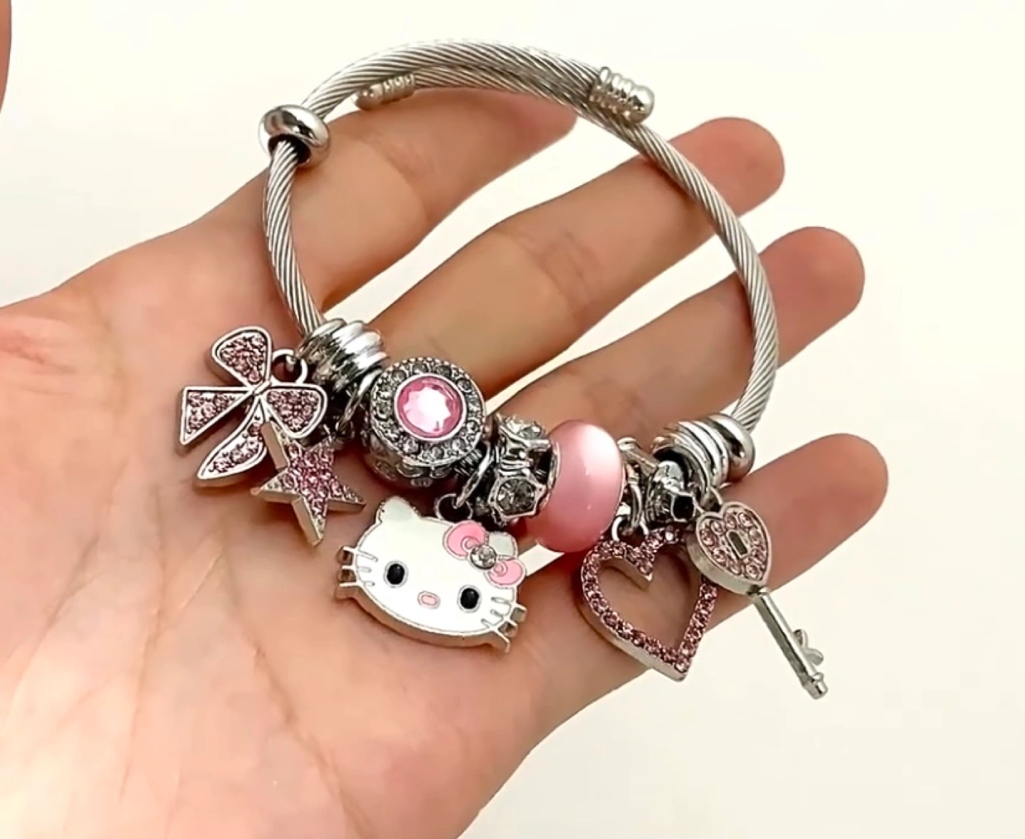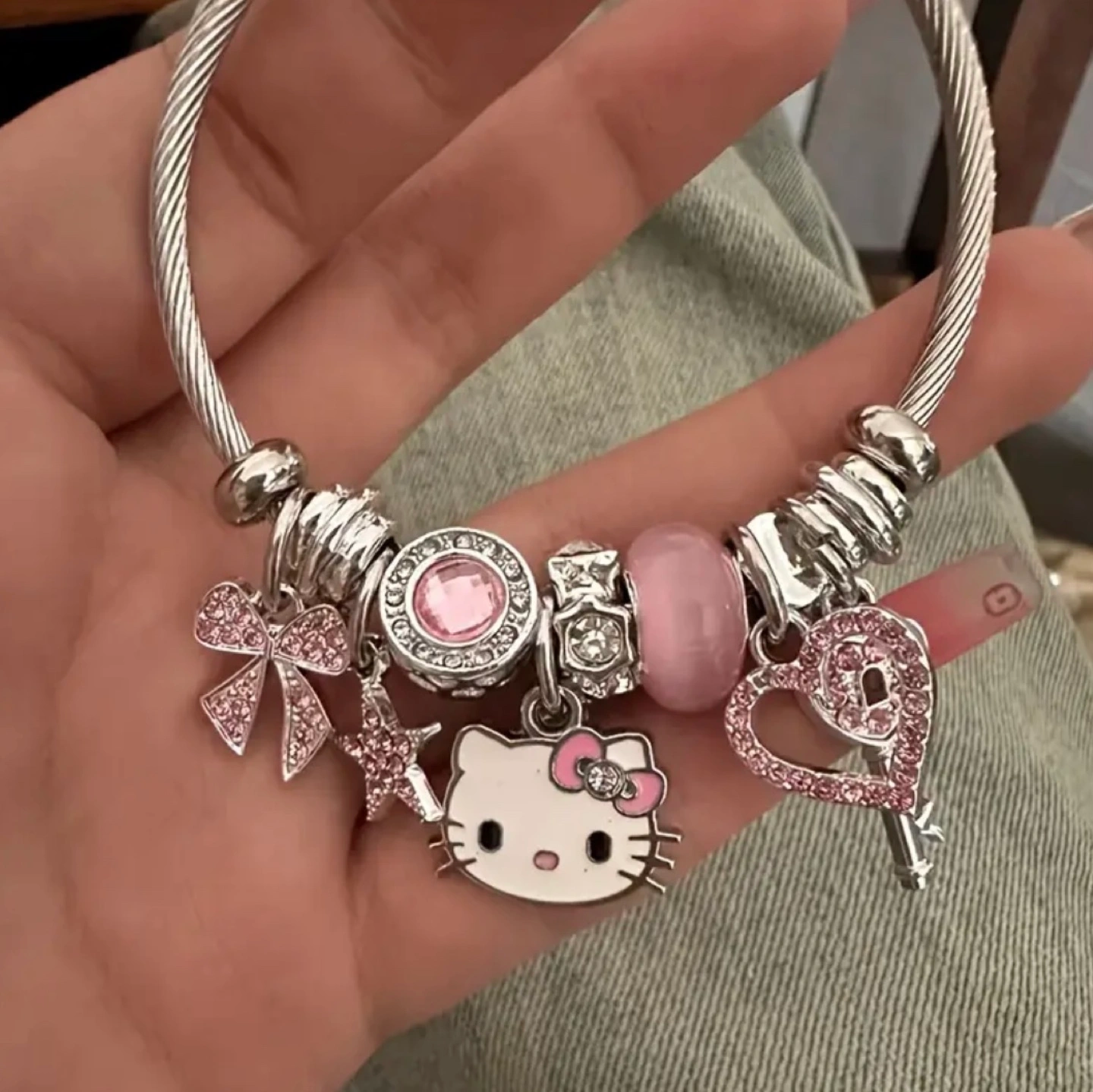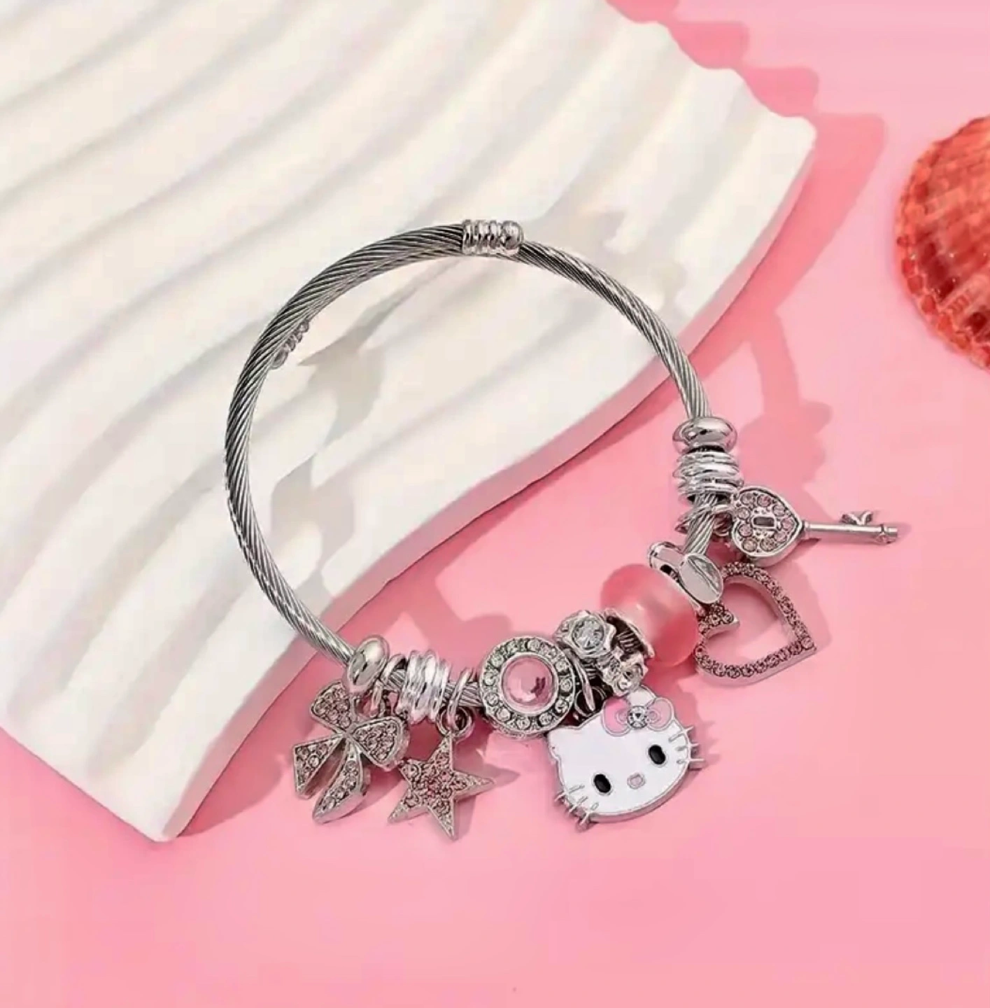 Adorable Hello Kitty charm bracelet. Features pink and silver charms, including a Hello Kitty face, bows, stars, hearts, and a key. Metal bangle bracelet. Lightweight and easy to wear.