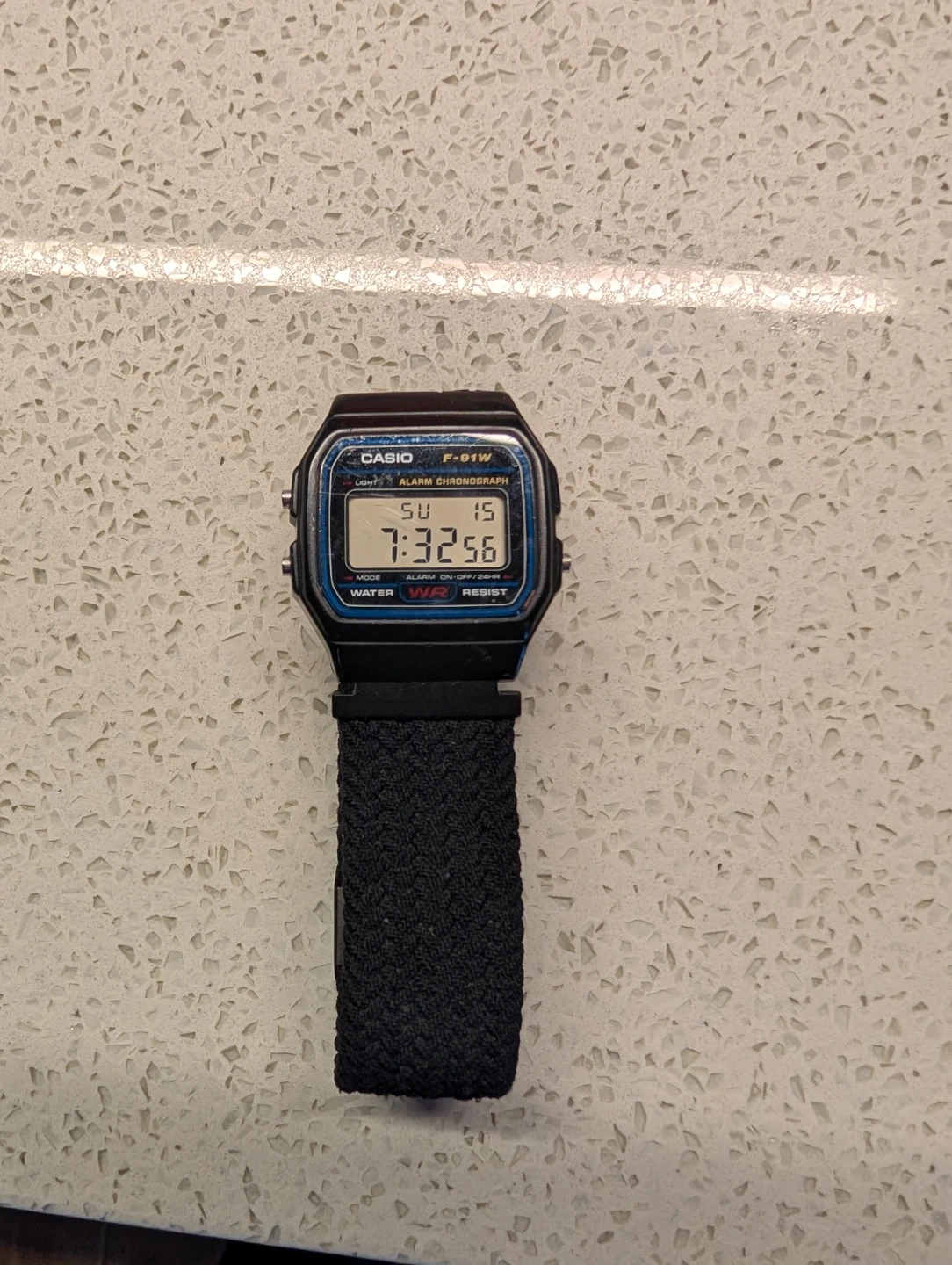 This is a Casio F-91W alarm chronograph digital watch. It features a black woven strap for comfort and durability. The watch has a clear digital display showing time, date, and alarm.