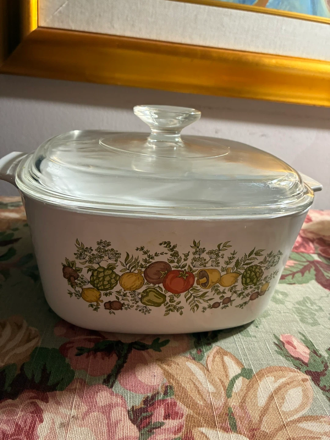 A vintage CorningWare casserole dish featuring a colourful vegetable pattern on the exterior. It comes with a clear glass lid. This dish is white inside and has sturdy handles.