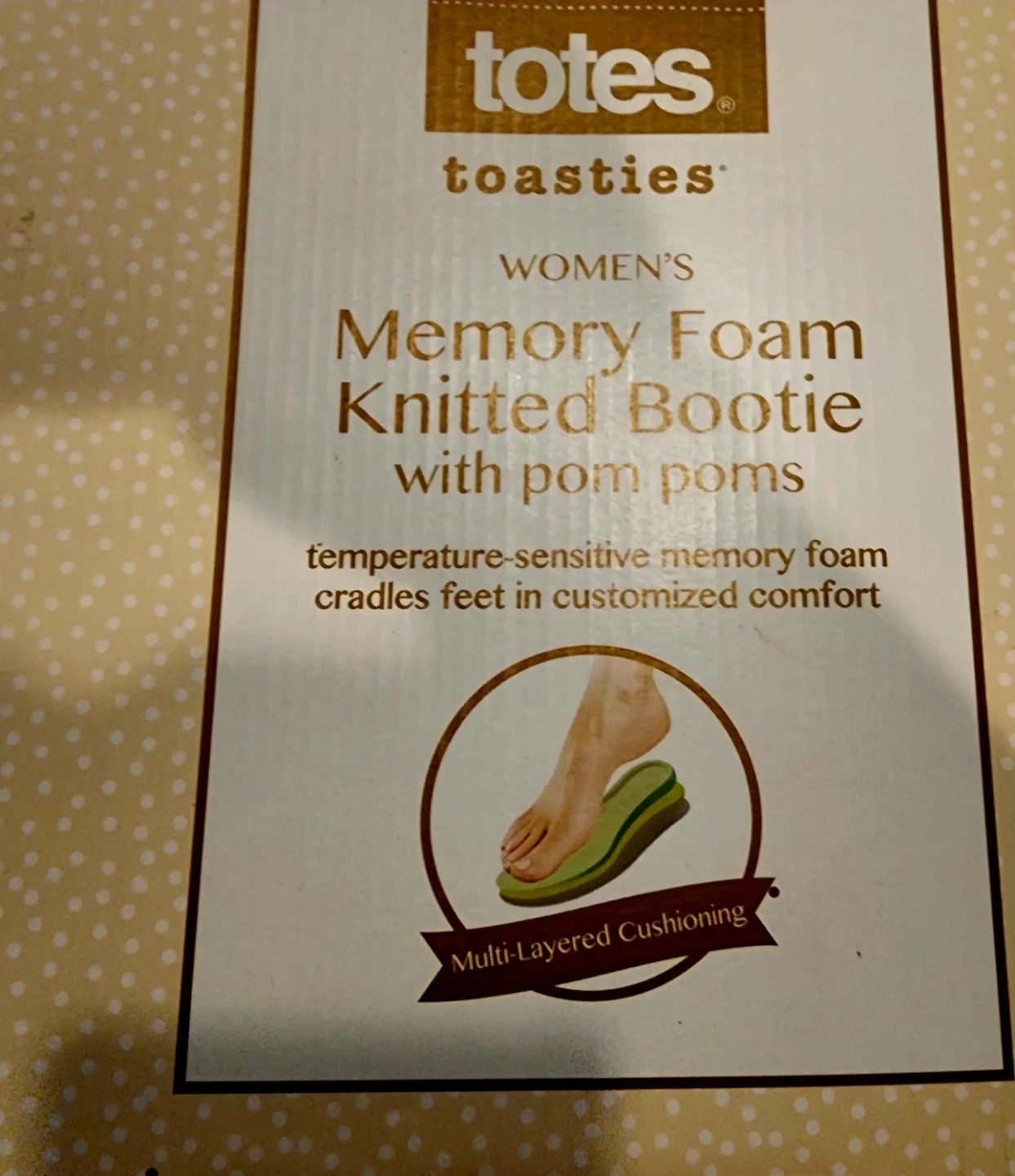 Women's Totes Toasties memory foam knitted bootie slippers. Feature pom poms and temperature-sensitive memory foam for comfort. Multi-layered cushioning.
