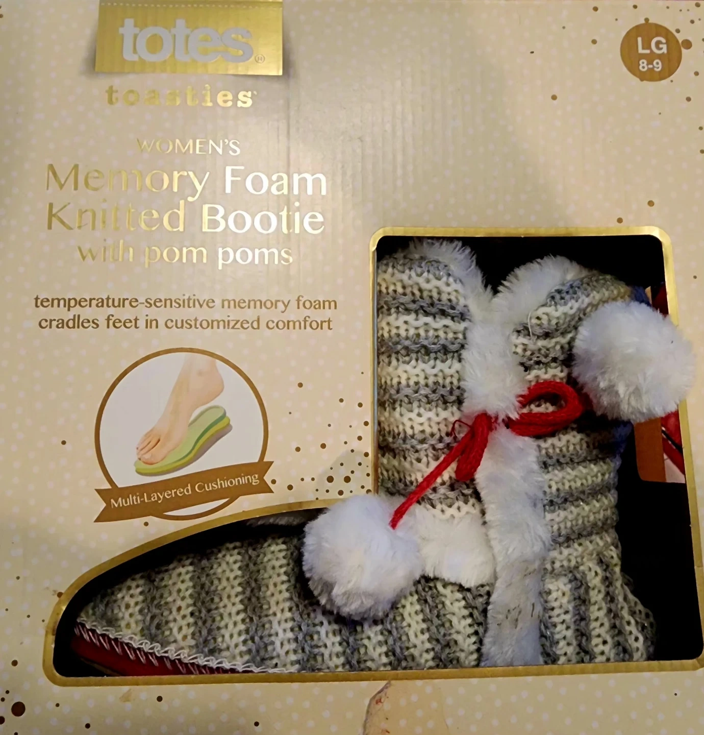 Women's Totes Toasties memory foam knitted bootie slippers. Feature pom poms and temperature-sensitive memory foam for comfort. Multi-layered cushioning.