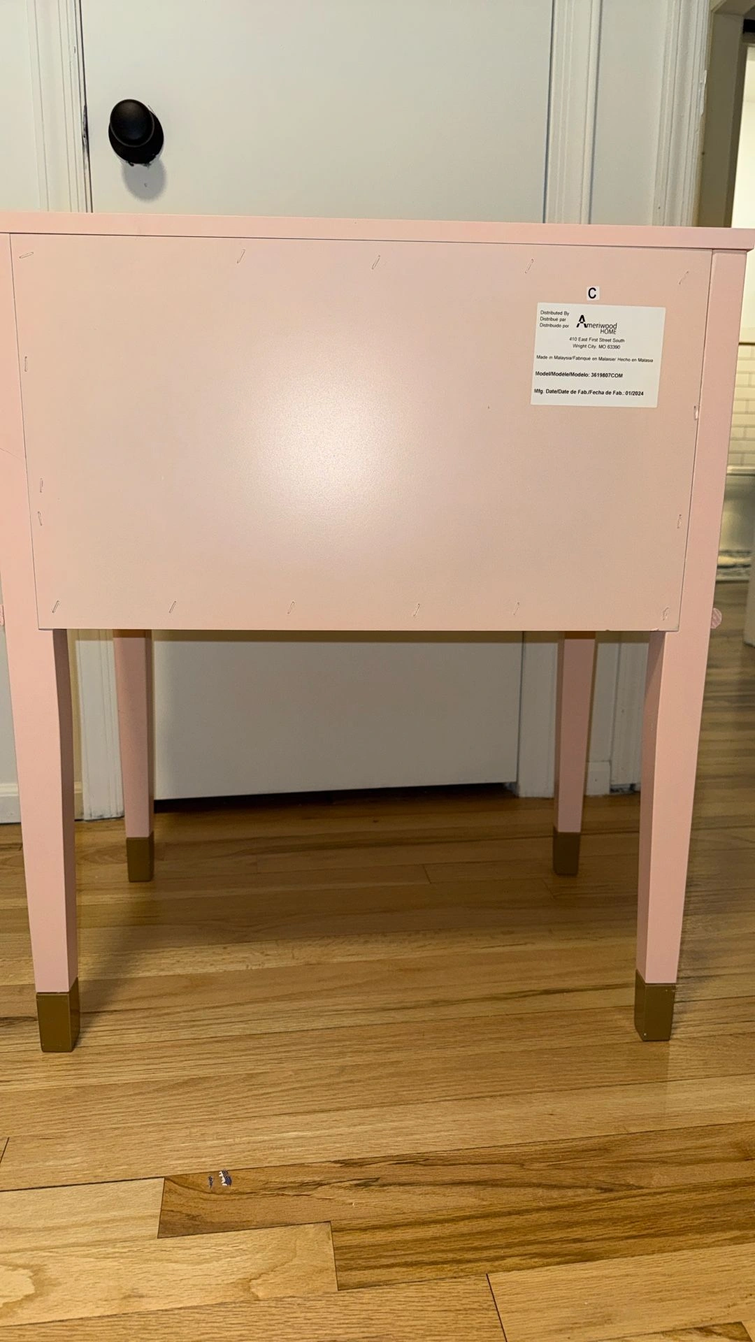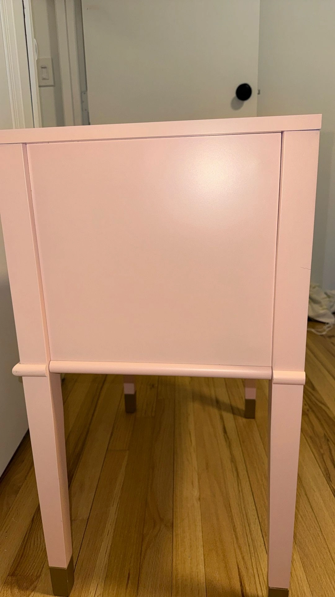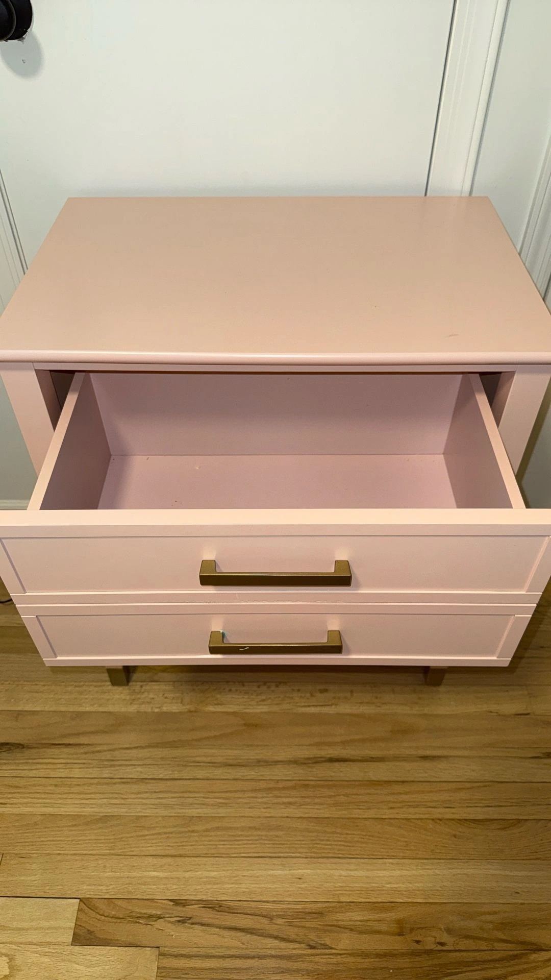 Lightly used blush pink bedside table/nightstand with a clean, modern look. Features smooth-gliding drawers for storage, gold/brass-tone handles, and matching gold leg caps for a polished finish. Sturdy, sits level, and looks great as a nightstand, end table, or small accent piece. Condition: Very good—light cosmetic wear from normal use (see photo). Pickup: Huntington