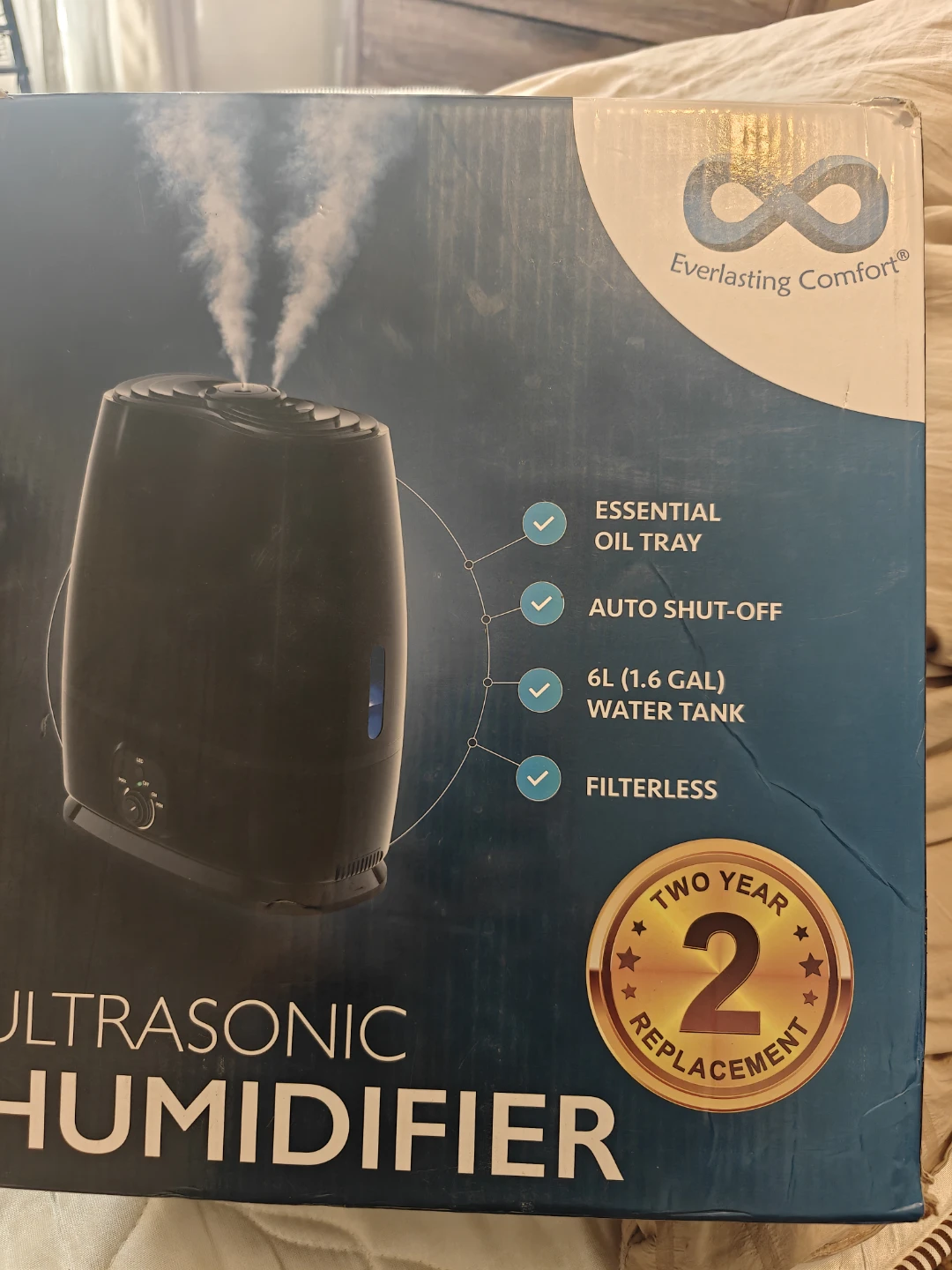 This is an Everlasting Comfort 6L Ultrasonic Cool Mist Humidifier. It has an essential oil tray, auto shut-off, a 6L water tank, and it's filterless.