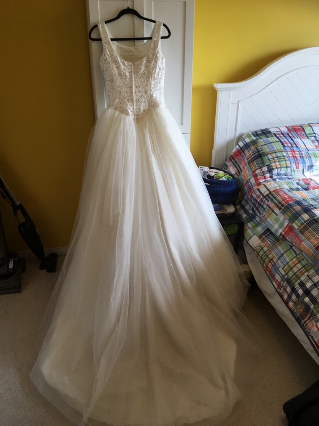 Beautiful sleeveless wedding dress with intricate beadwork on the bodice. It features a full tulle skirt with scattered pearl accents. This dress is ready for your special day!