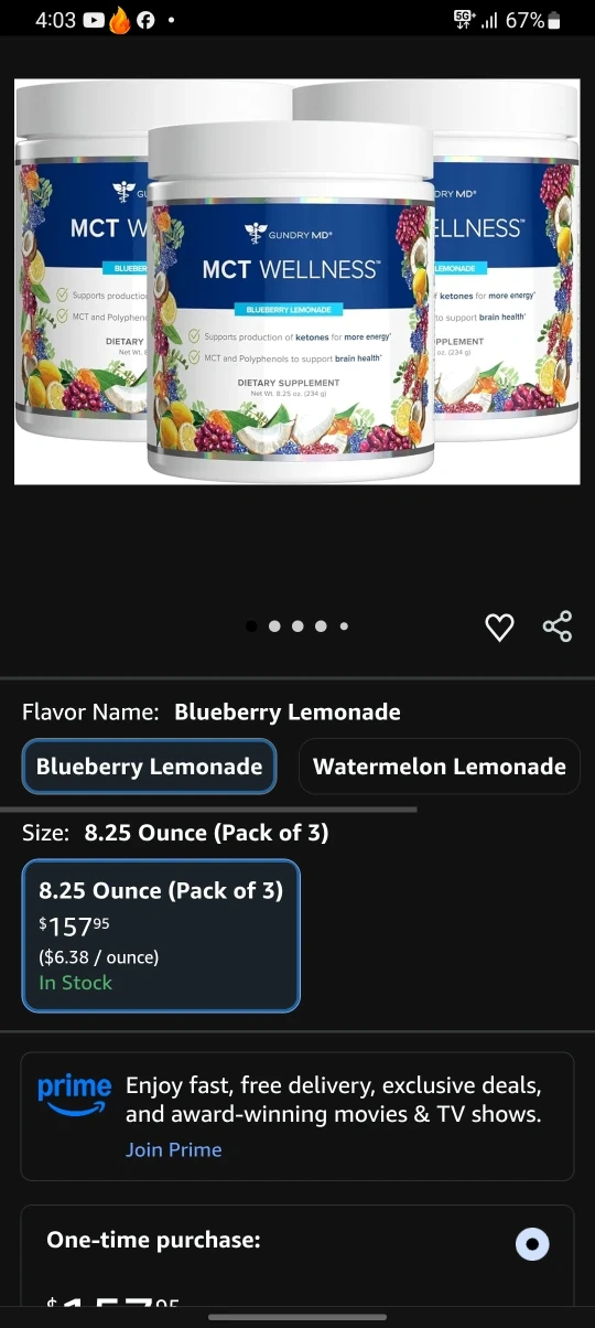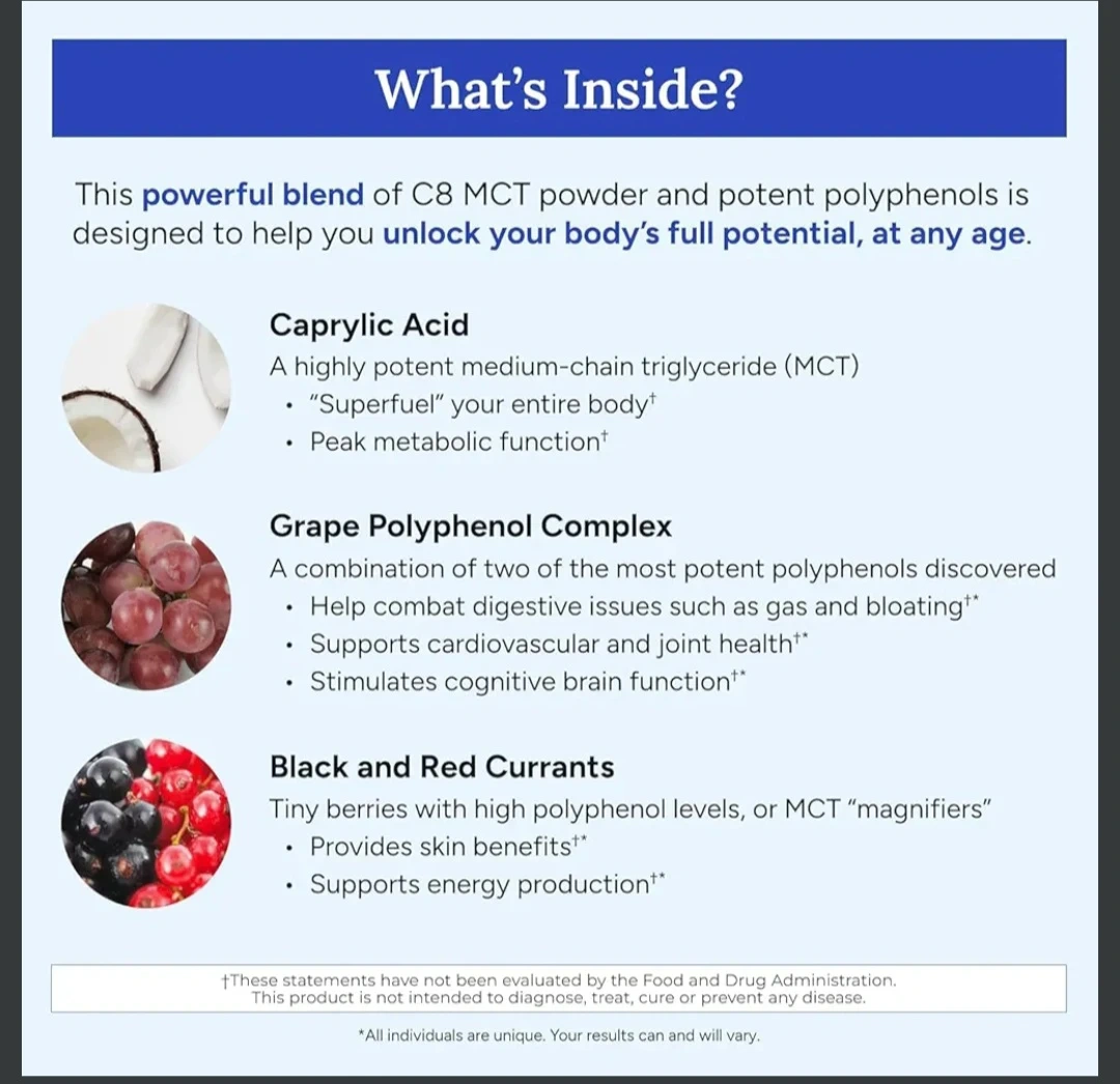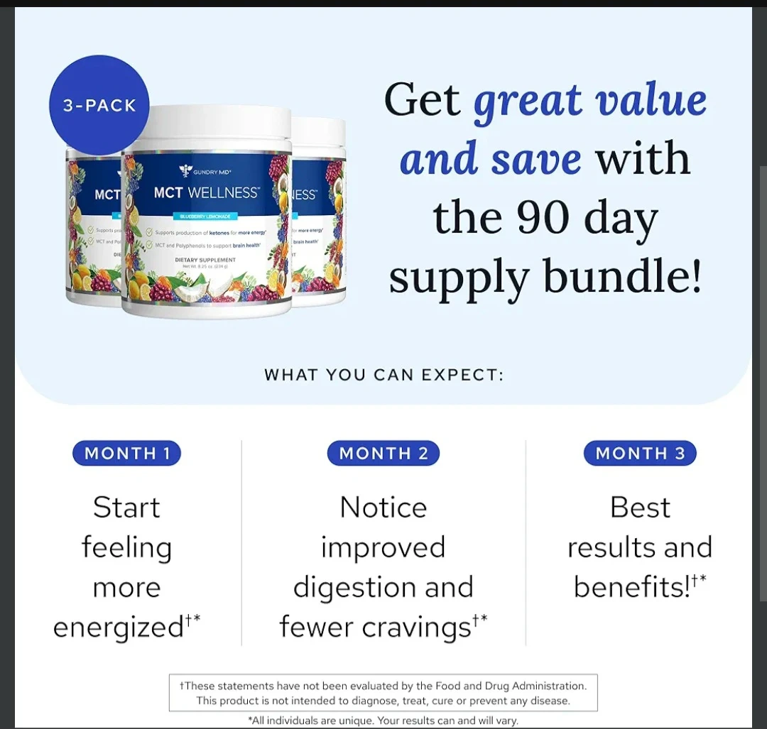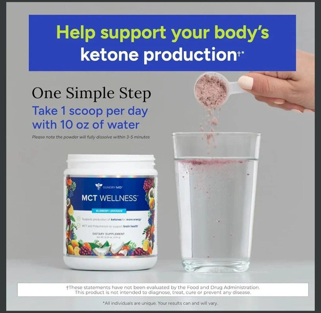 Dr. Gundry MD MCT Wellness in Blueberry Lemonade flavor. This dietary supplement contains C8 MCT powder and potent polyphenols. It's designed to support energy and brain health. Each container has 30 servings.
