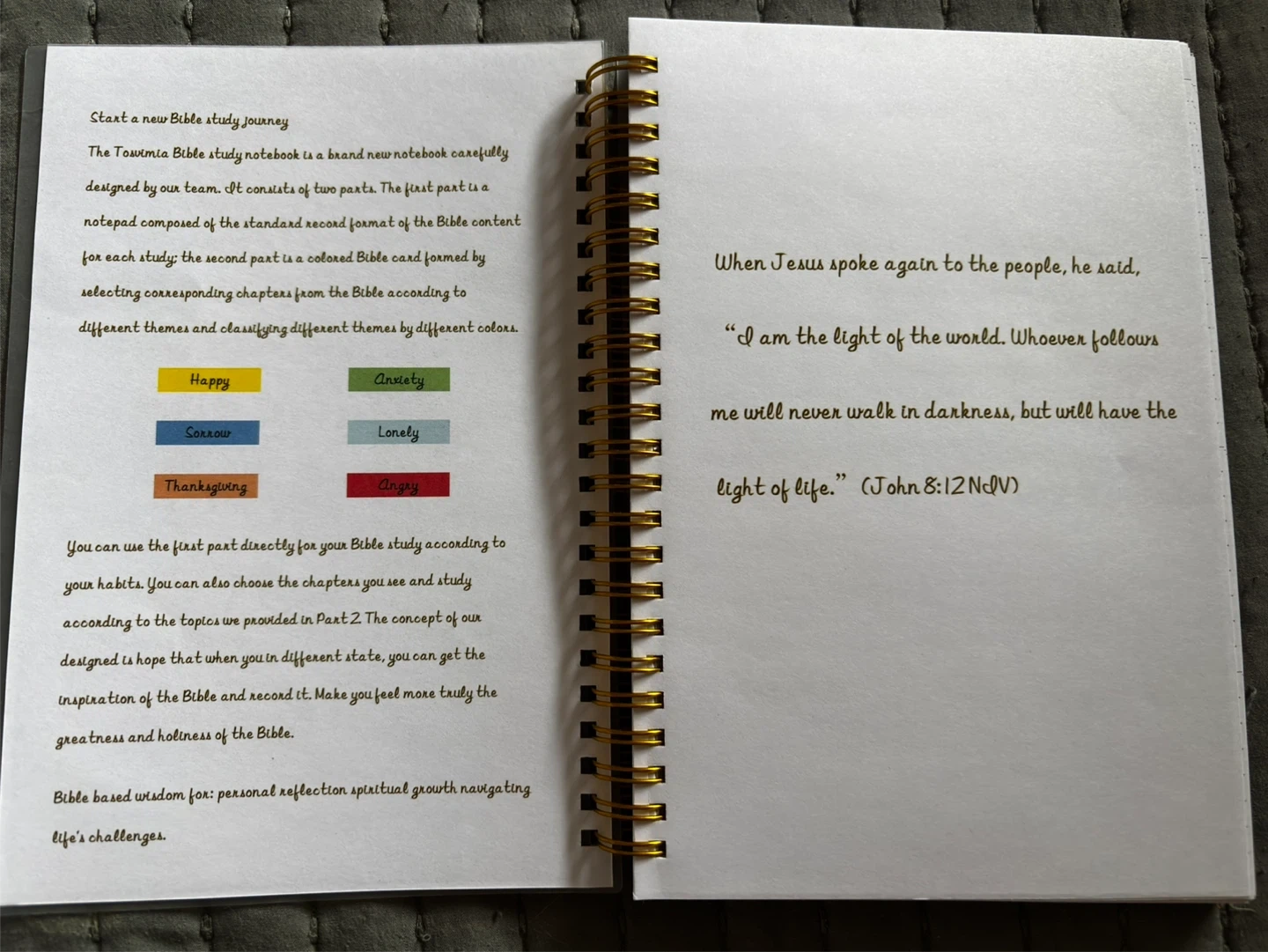 It consists of two parts, with the first part being a notepad composed of the standard record format of the Bible content for each study. The second part is a coloured Bible card, formed by selecting corresponding chapters from the Bible according to different themes and classifying different themes by different colours. You can use the first part directly for your Bible study according to your habits.