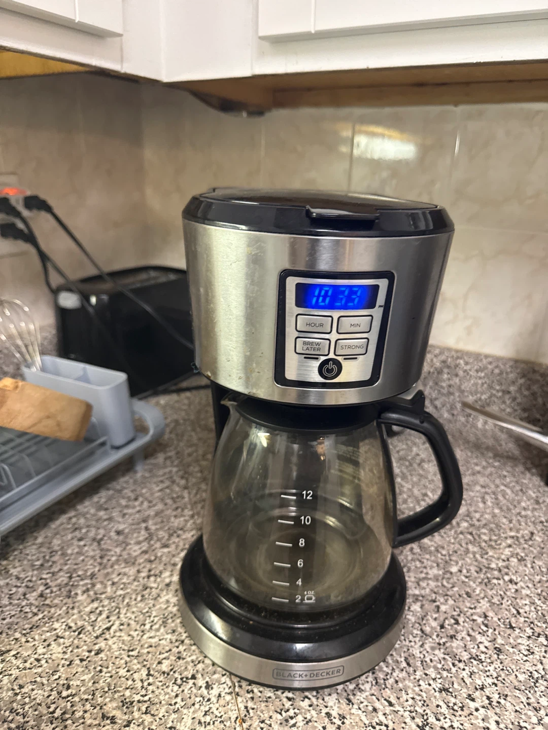 Selling a Black+Decker coffee maker. It has a digital display showing the time and buttons for hour, minute, brew later, and strong. The carafe has markings up to 12 cups