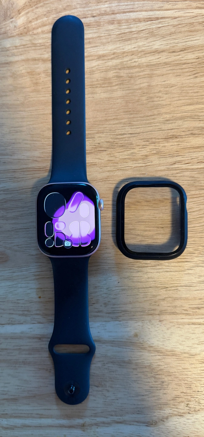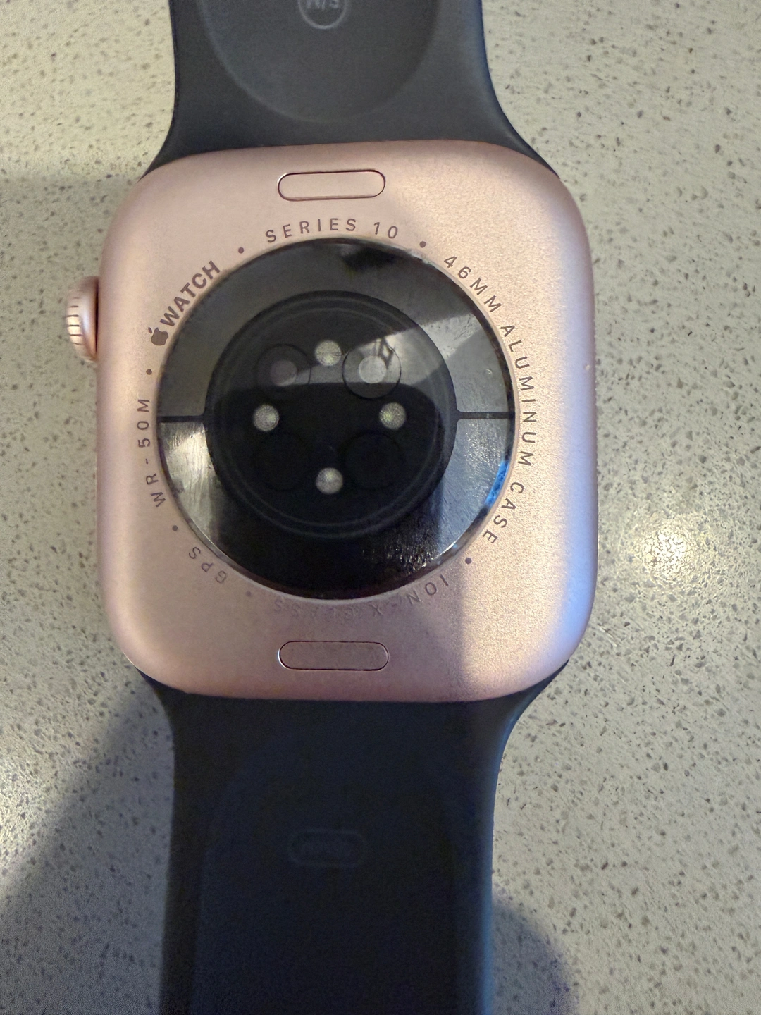 Apple Watch Series 10 [GPS 46mm] Smartwatch with Rose Gold Aluminium Case with Black Sport Band.