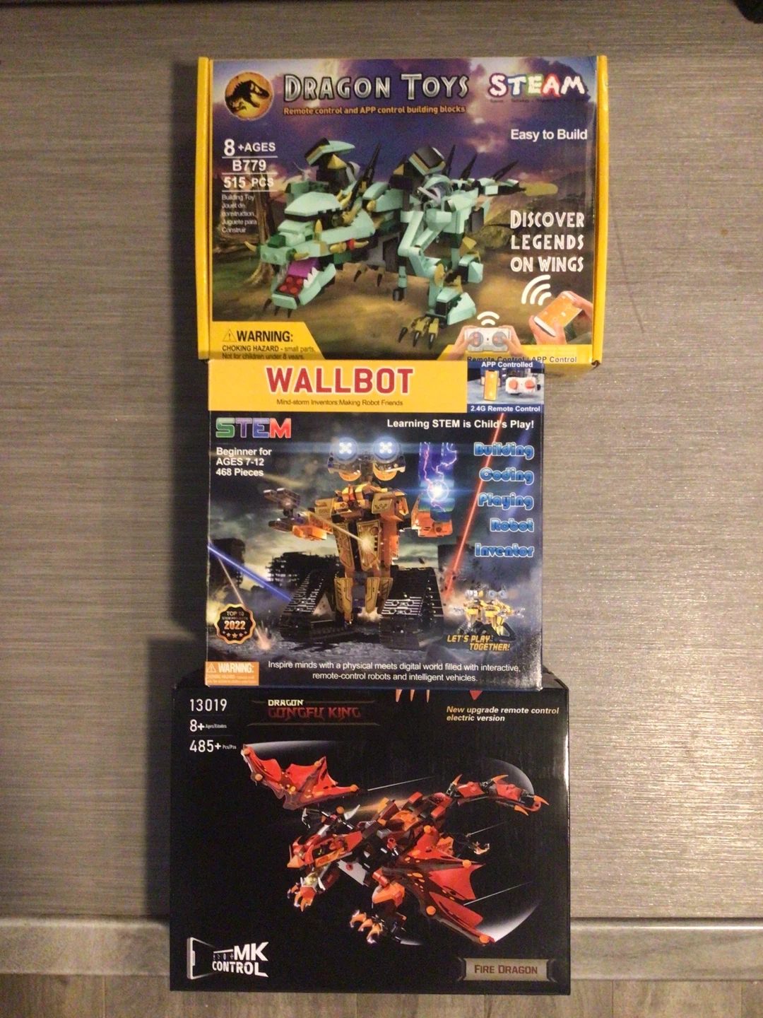 Dragon Toys Steam building blocks come with remote and APP control features. The B779 set includes 515 pieces and is suitable for ages 8 and up. Another set, WALLBOT, is a beginner STEM toy for ages 7-12 with 468 pieces. The third set is Dragon GONGFU KING, an electric version with 485+ pieces, also for ages 8+.