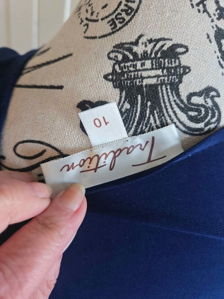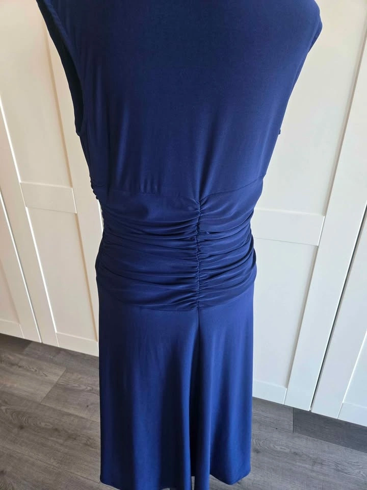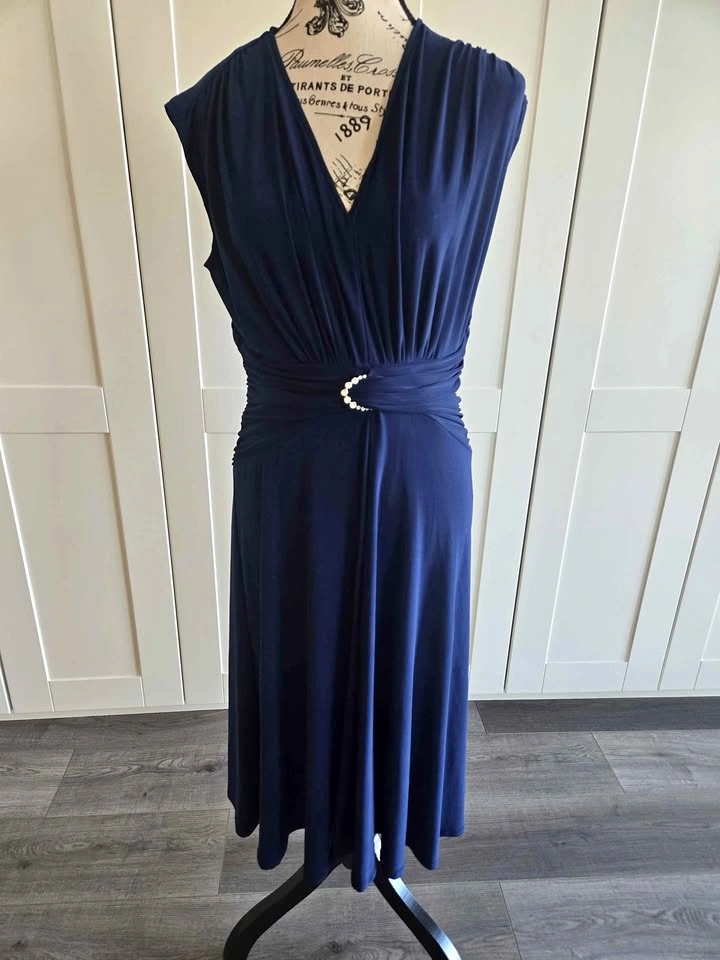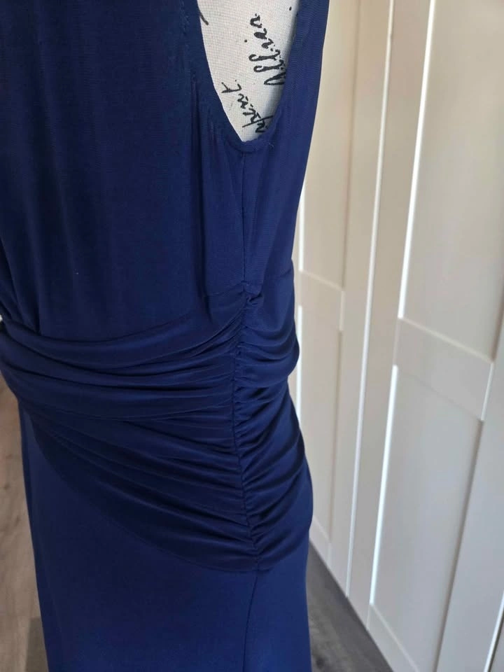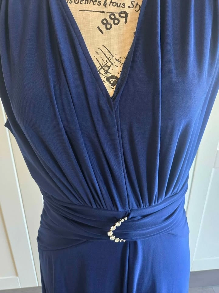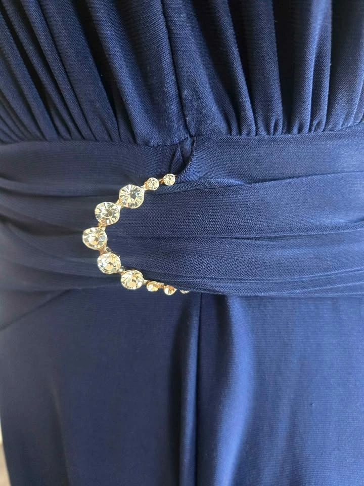 This is a stunning and slimming navy blue dress, size 10. Perfect to wear to a function or a wedding. Material is polyester spandex. Located in Huntington Hills NW.