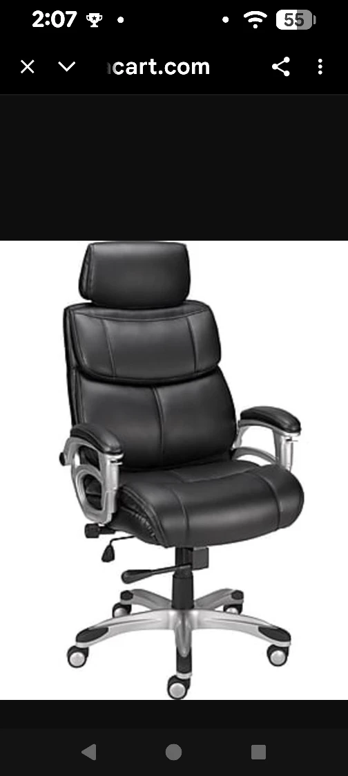 Selling a black leather executive office chair. It features a high back with adjustable headrest , arms, height, and recline and tilt functions. With well padded seat and arms that use memory foam providing enhanced comfortable support. The chair has a silver-colored base with rolling casters. Perfect for your home office or workspace!
