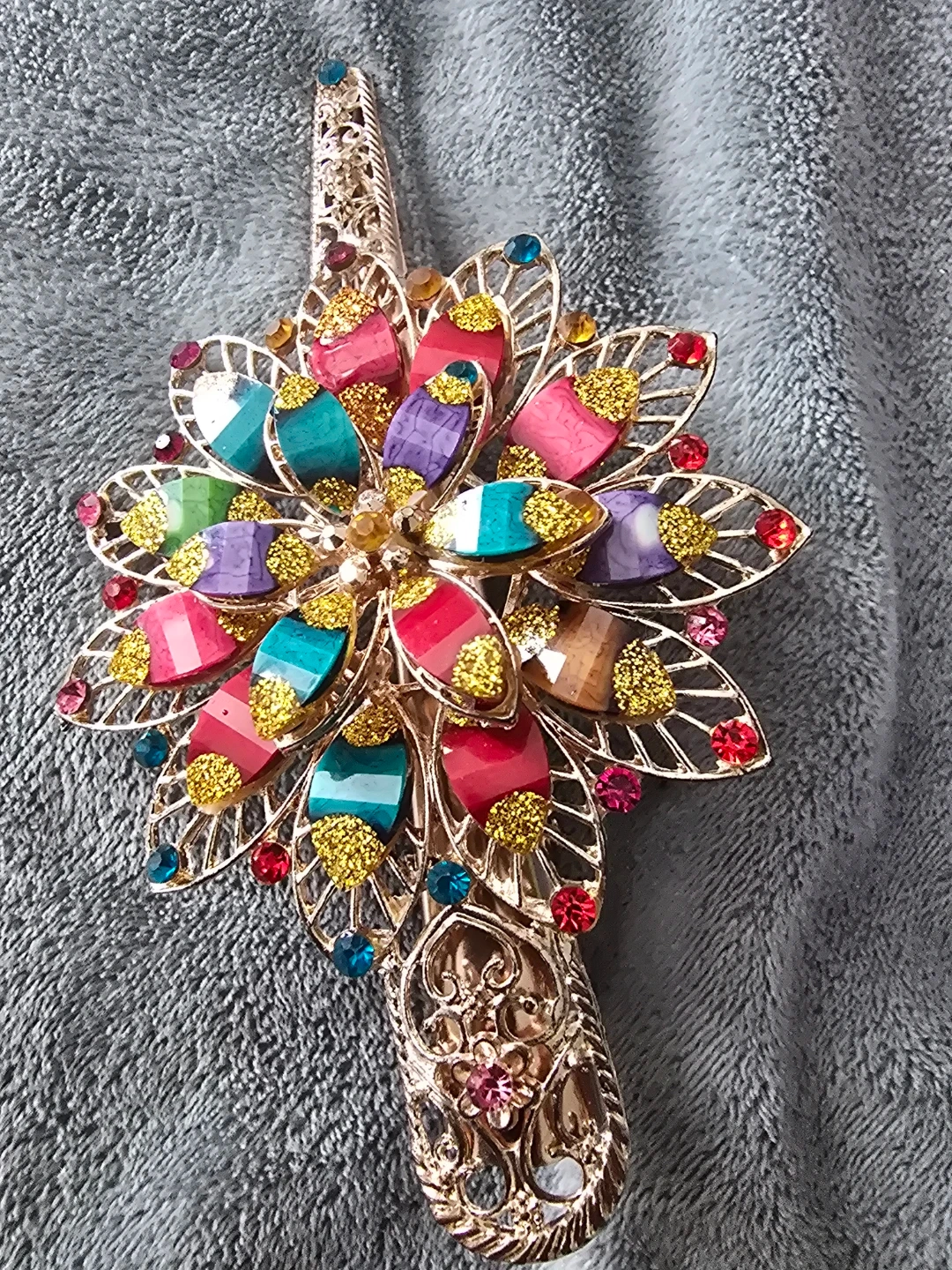 This set includes a vintage-style cameo brooch with faux pearls and a colourful floral hair clip. The cameo features a classic profile design, surrounded by sparkling rhinestones. The floral clip has a gold-tone metal base with brightly coloured inlaid stones and glitter accents. These decorative clips add a touch of elegance and flair to any hairstyle.