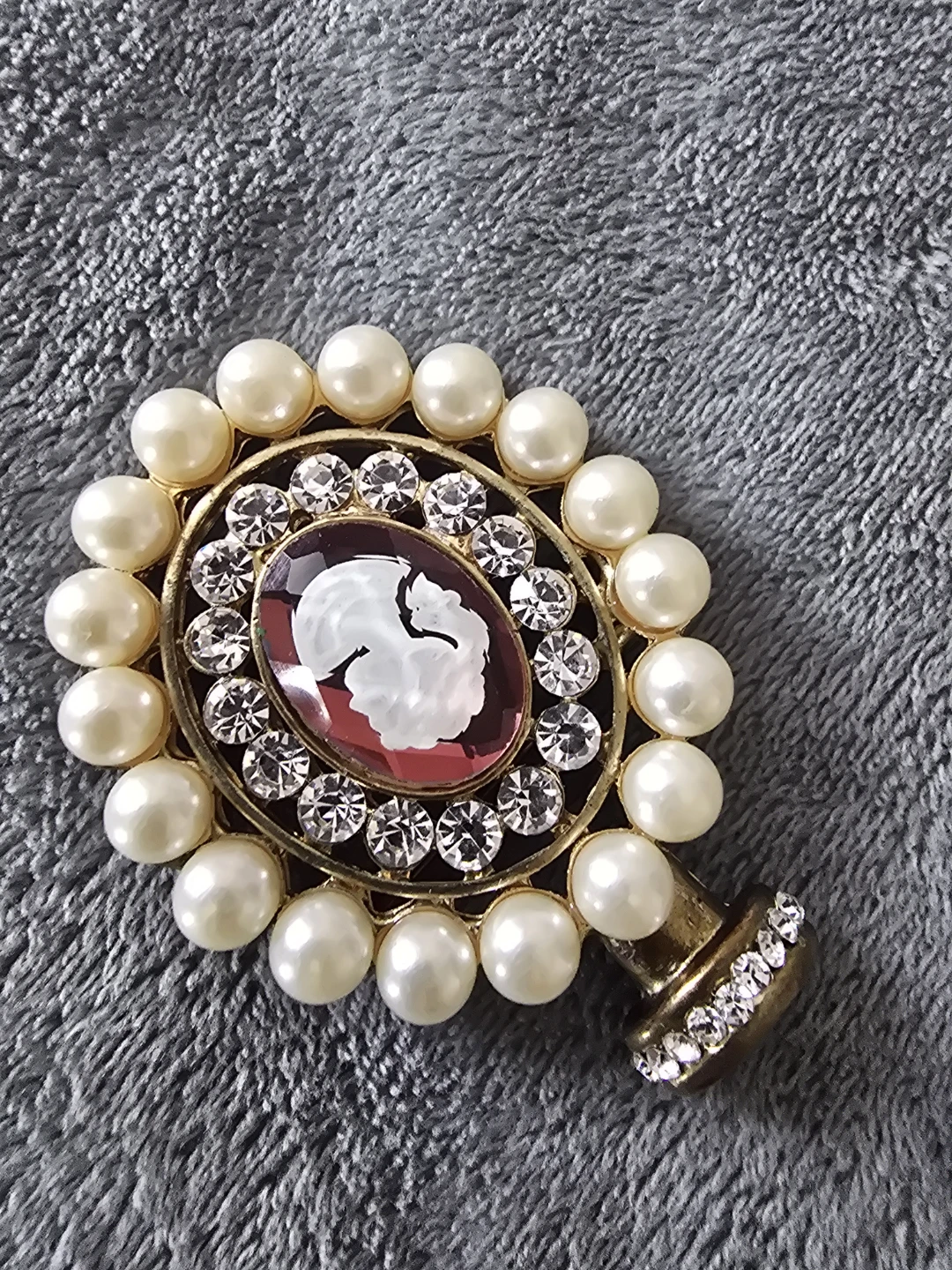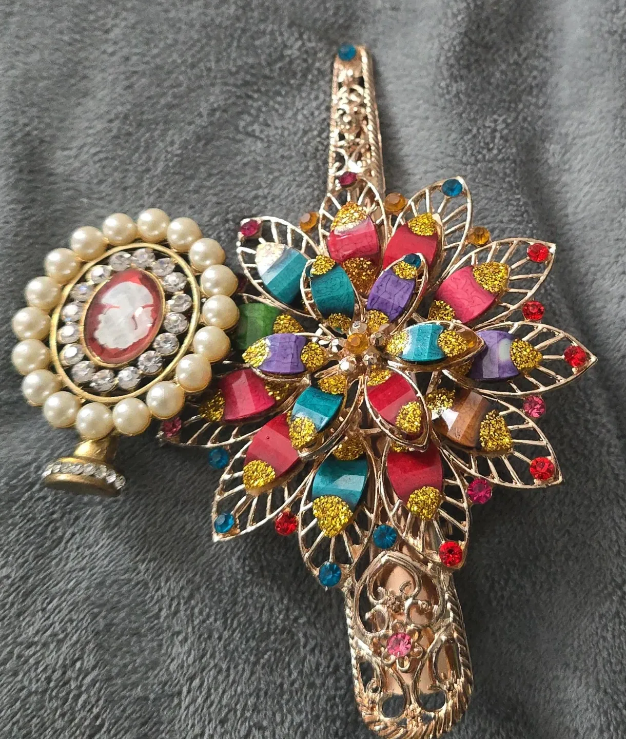This set includes a vintage-style cameo brooch with faux pearls and a colourful floral hair clip. The cameo features a classic profile design, surrounded by sparkling rhinestones. The floral clip has a gold-tone metal base with brightly coloured inlaid stones and glitter accents. These decorative clips add a touch of elegance and flair to any hairstyle.