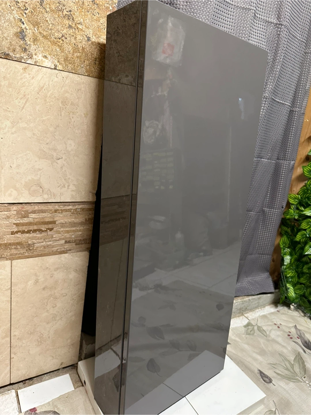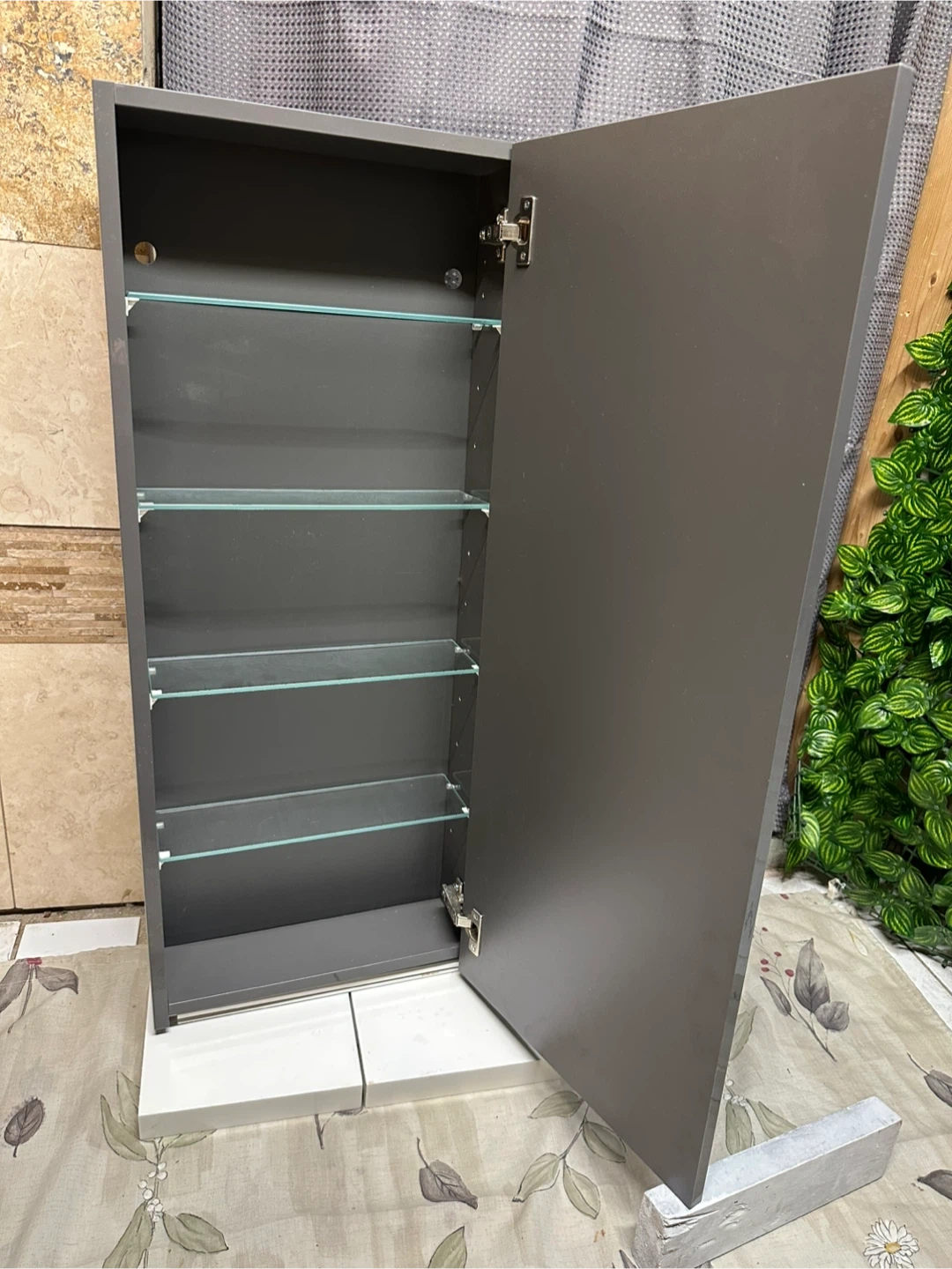 This IKEA GODMORGON wall cabinet features a high gloss grey finish. It comes with adjustable glass shelves for storage. Made in Italy.