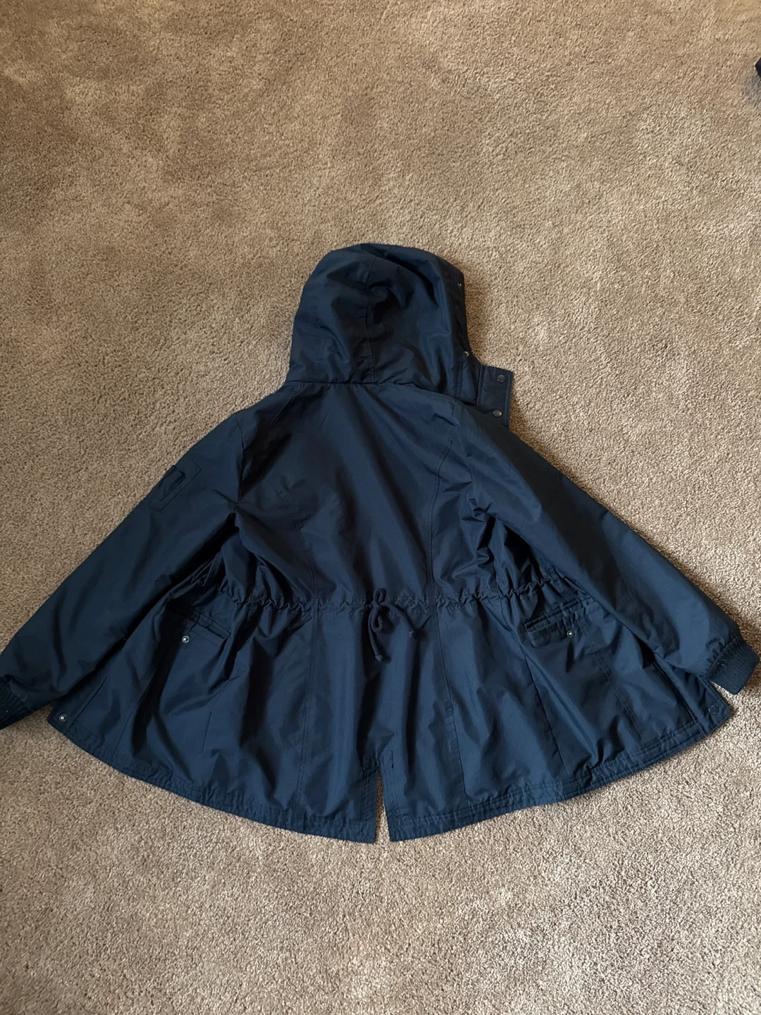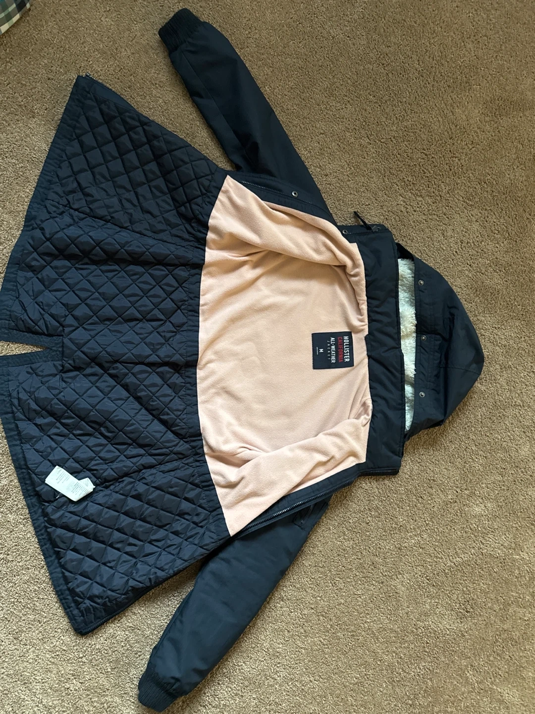 This is a Hollister All-Weather parka jacket in a women's medium size. It's a dark navy colour with a quilted exterior and a soft pink sherpa lining inside. The hood is attached and it has adjustable drawstrings at the waist.