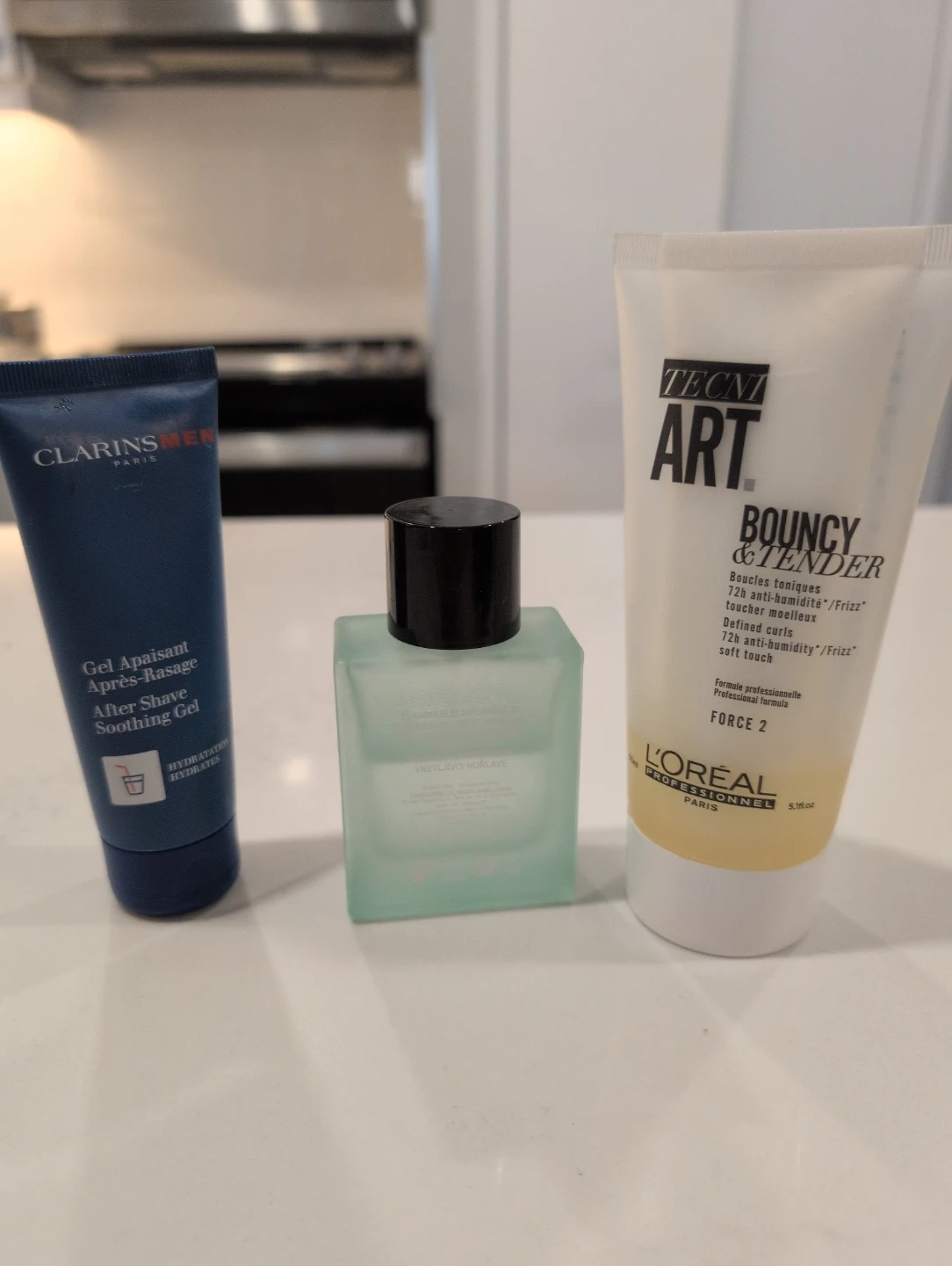 Includes ClarinsMen After Shave Soothing Gel and L'Oréal Tecni Art Bouncy & Tender styling cream. The L'Oréal cream provides 72h anti-humidity and a soft touch for defined curls.