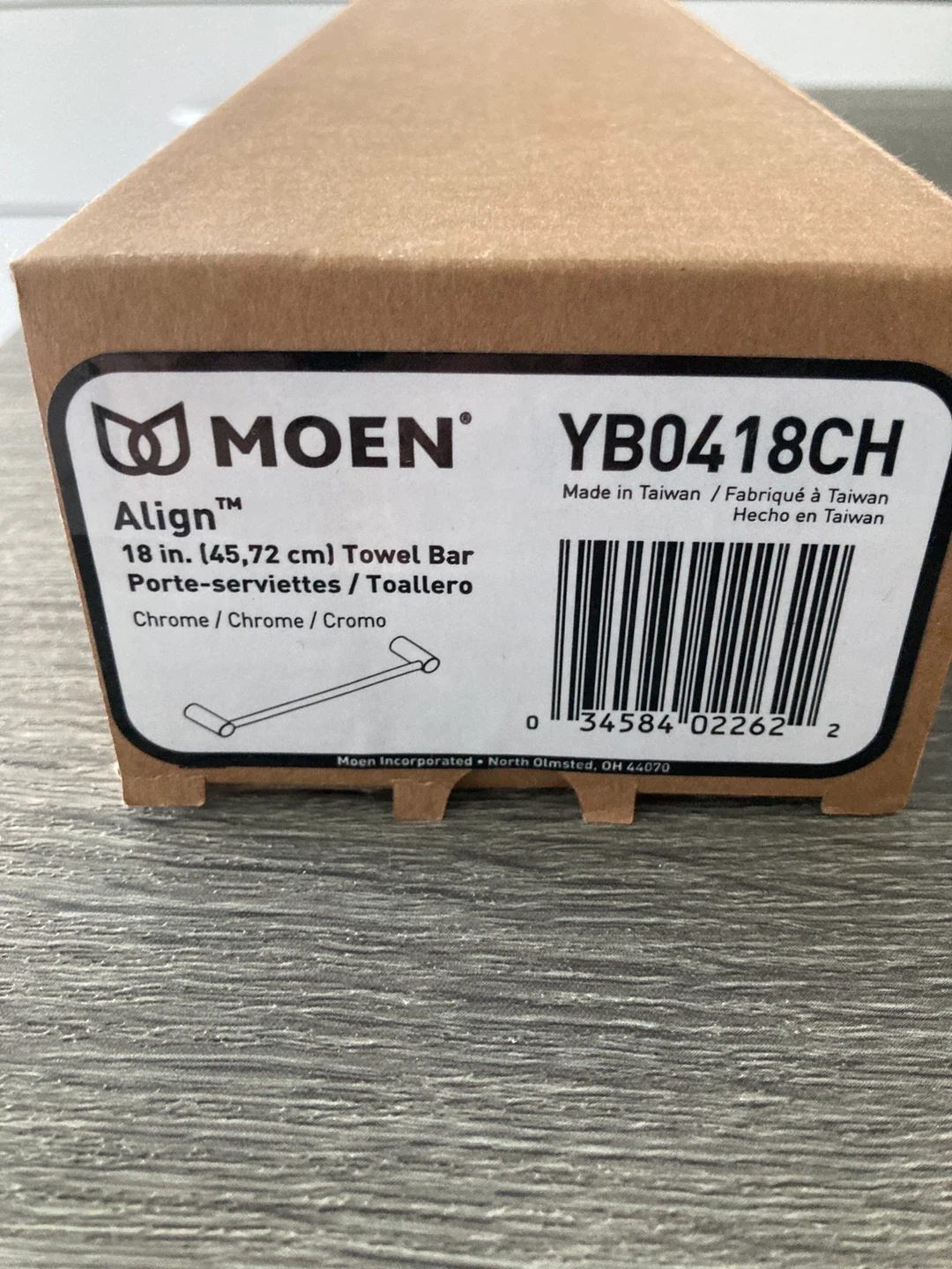 Selling a brand new Moen Align towel bar, still in its original packaging! It's a chrome finish and measures 18 inches (45.72 cm). The model number is YB0418CH. Perfect for adding a sleek and modern touch to your bathroom