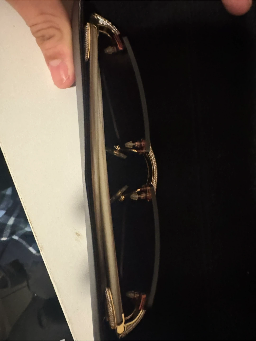 Selling a pair of Cartier sunglasses that are in great condition! They come with their original case for safekeeping. The sunglasses have a light pink tint and the frames have some bling. Perfect for sunny days! Their Moissanite diamonds. The right wing on it is also a little faulty.