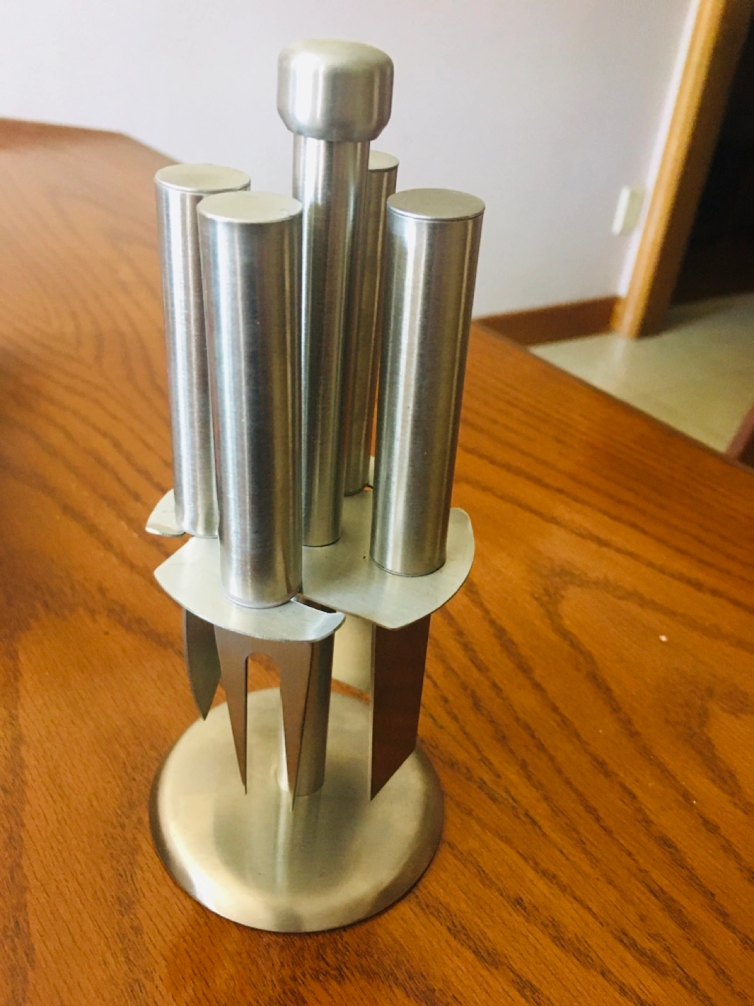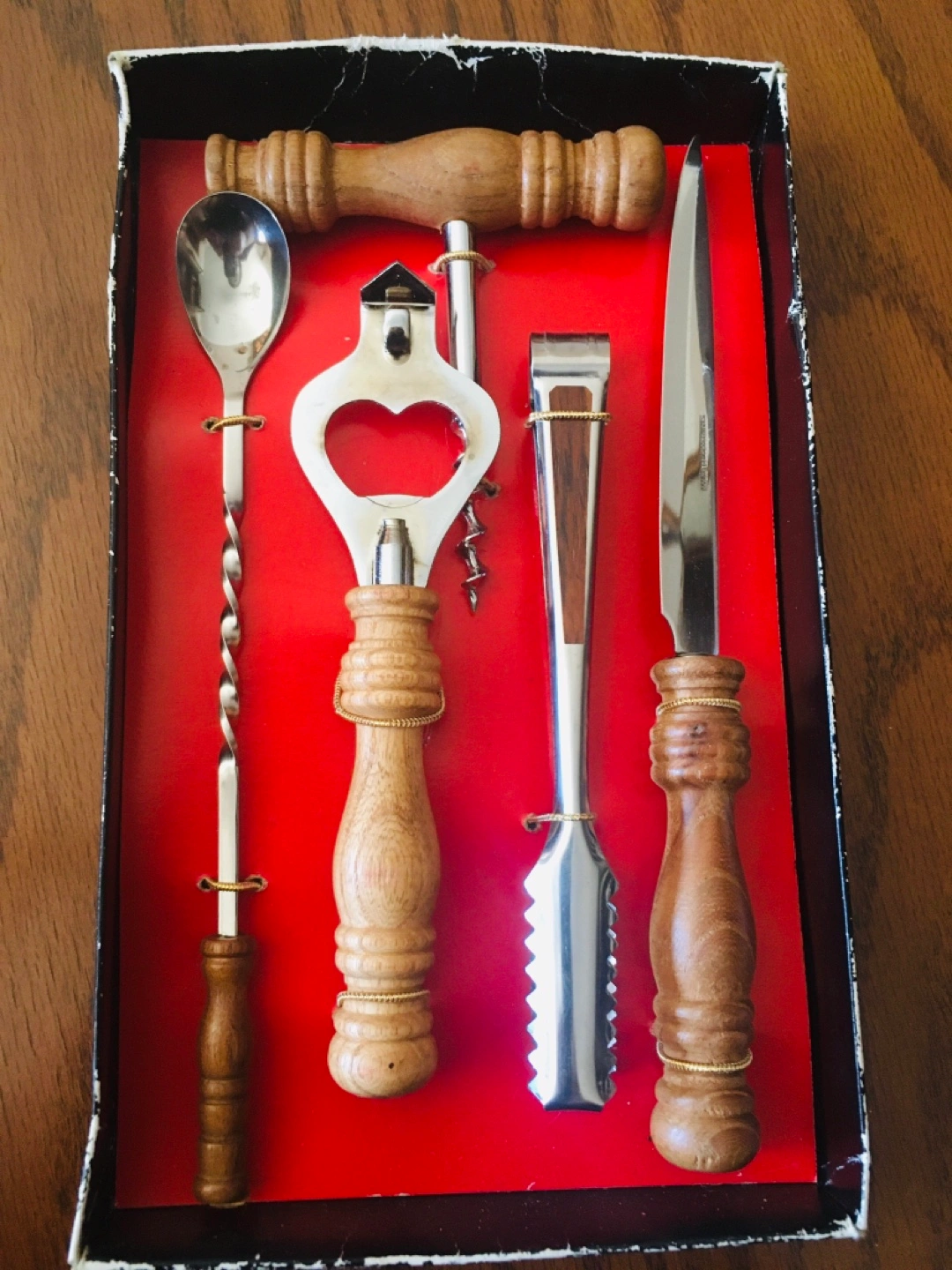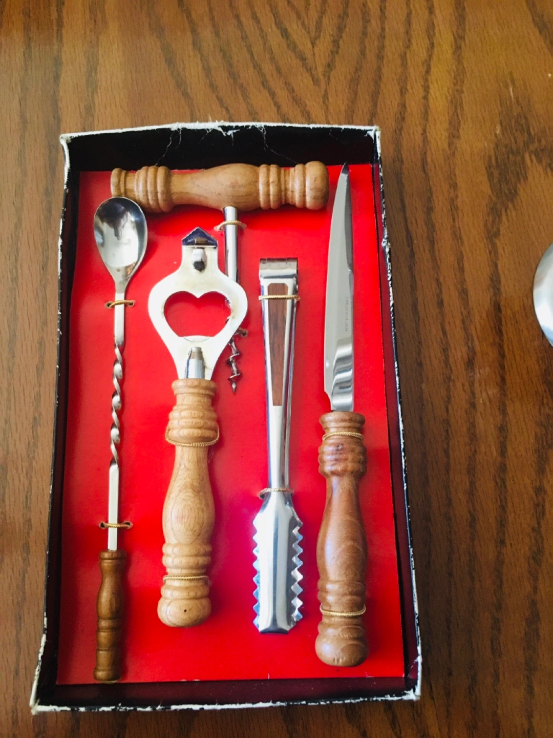 Two sets of vintage kitchen tools. One set includes a cheese knife, spreader, and two forks. All stainless steel with a stand. The other set features a corkscrew, bottle opener, cocktail spoon, and ice tongs. Wooden handles. Both sets are in good condition. $10 each or both for $15