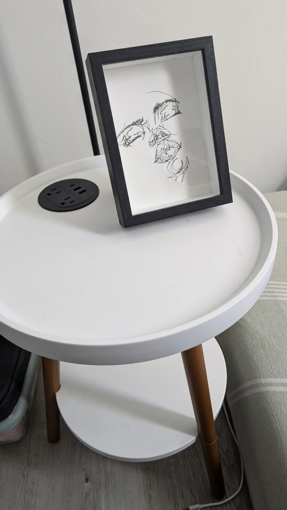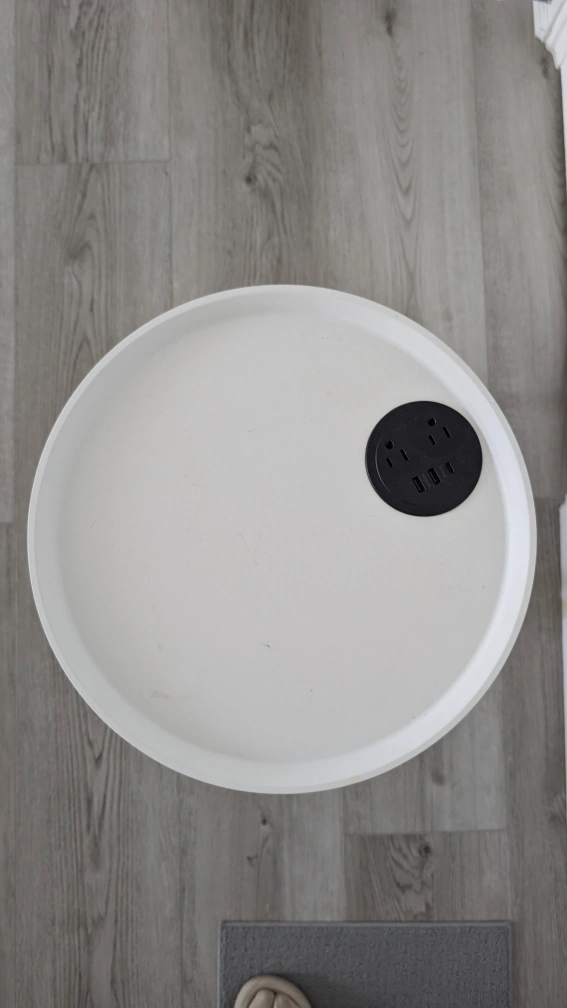 Round end table with built-in power outlet and USB ports. Wooden legs. White top.Round Small Coffee Table, Creative Wooden Load-Bearing Non-deform