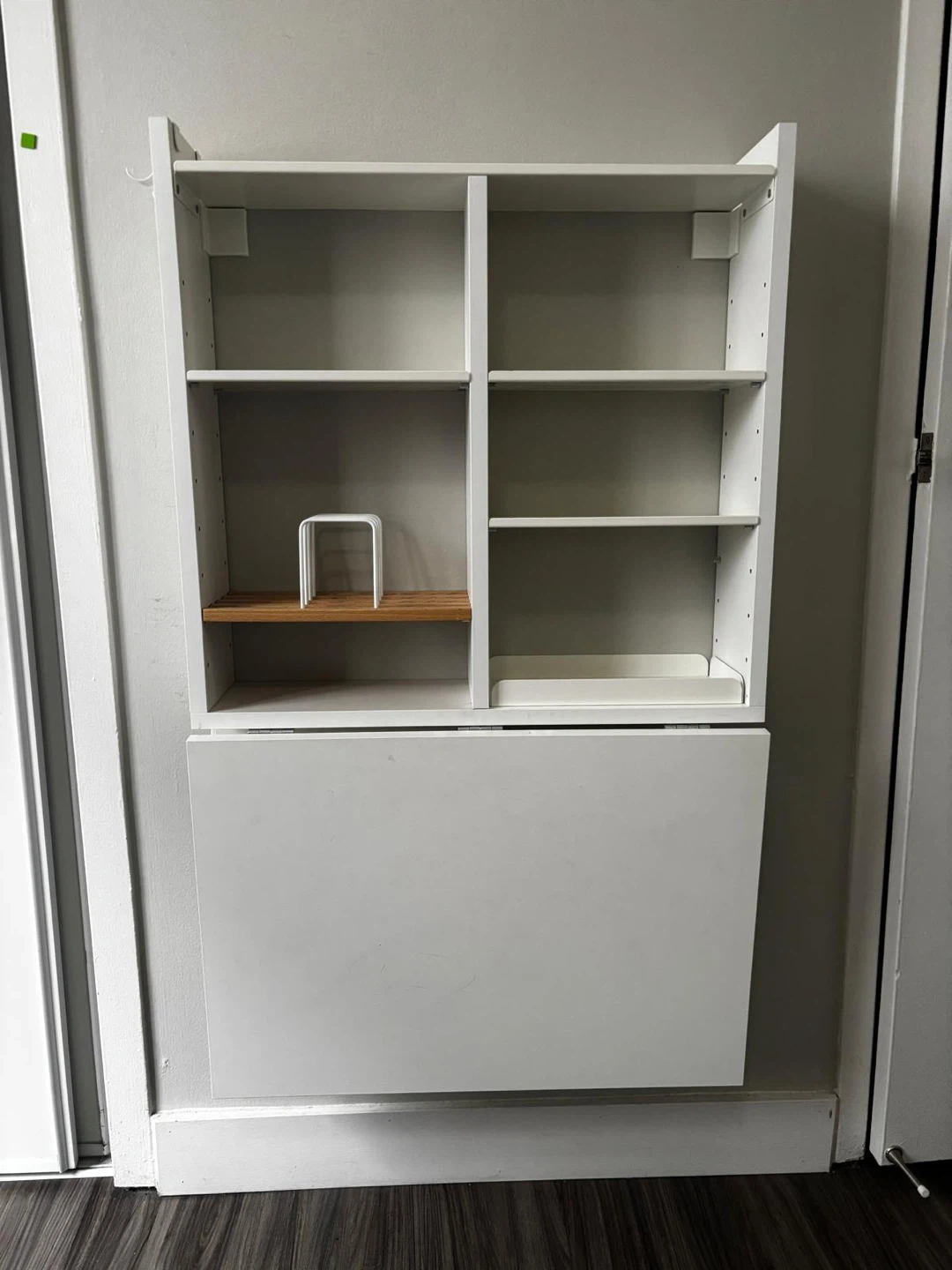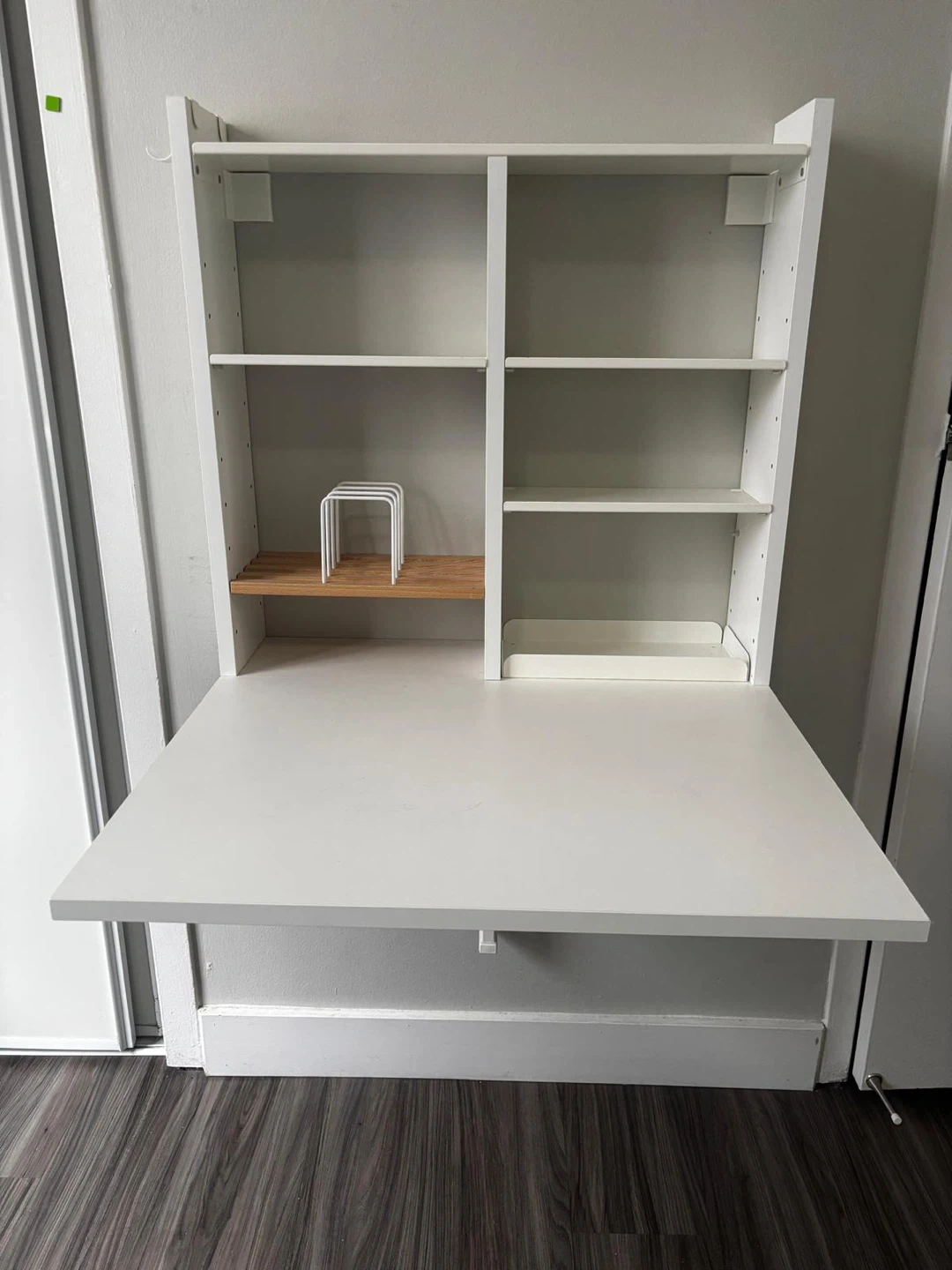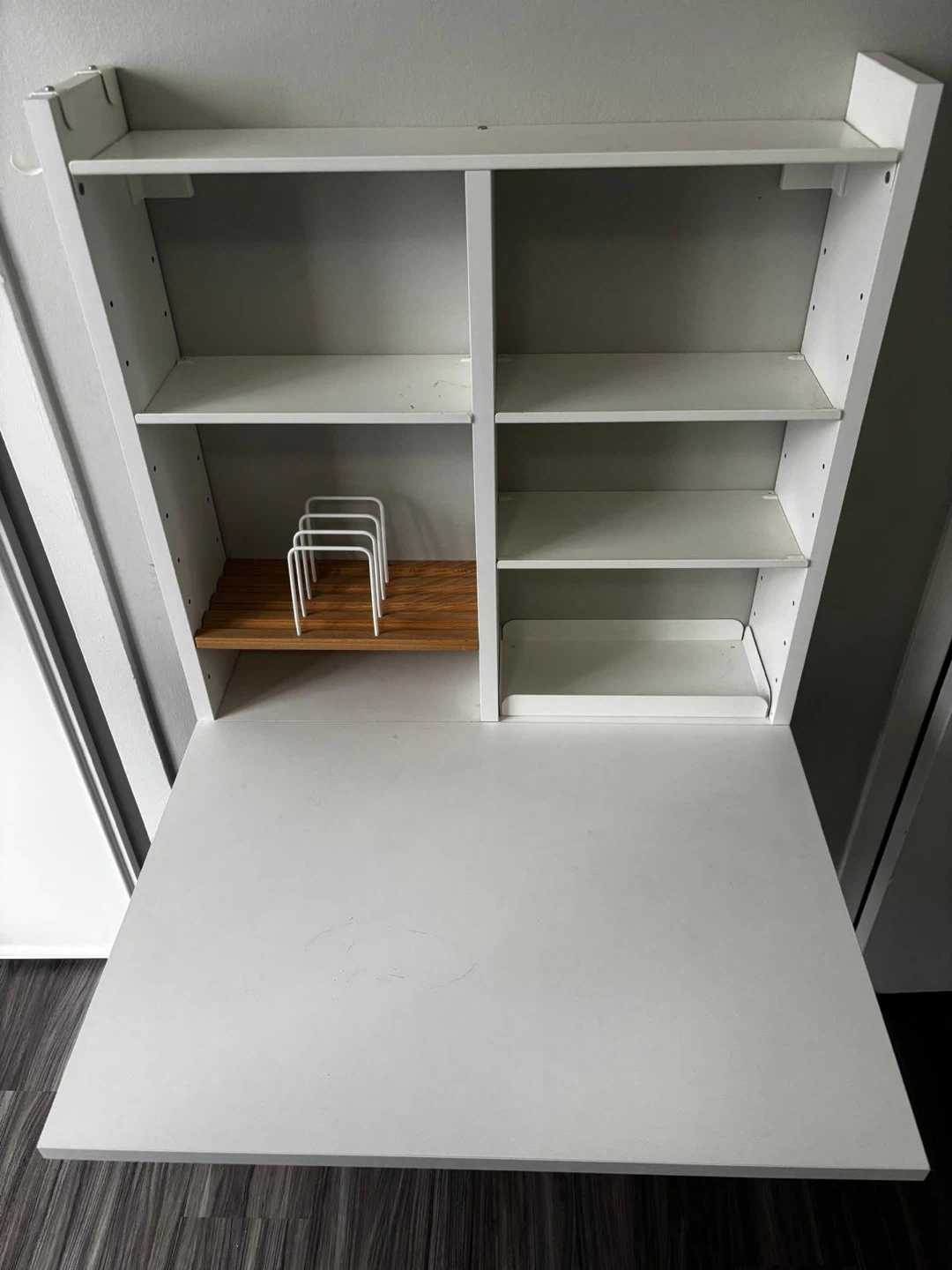 This is a white fold-down desk with multiple shelves for storage. It's great for small spaces, offering a work surface that tucks away neatly. The unit is made of particleboard and includes a wooden shelf insert.